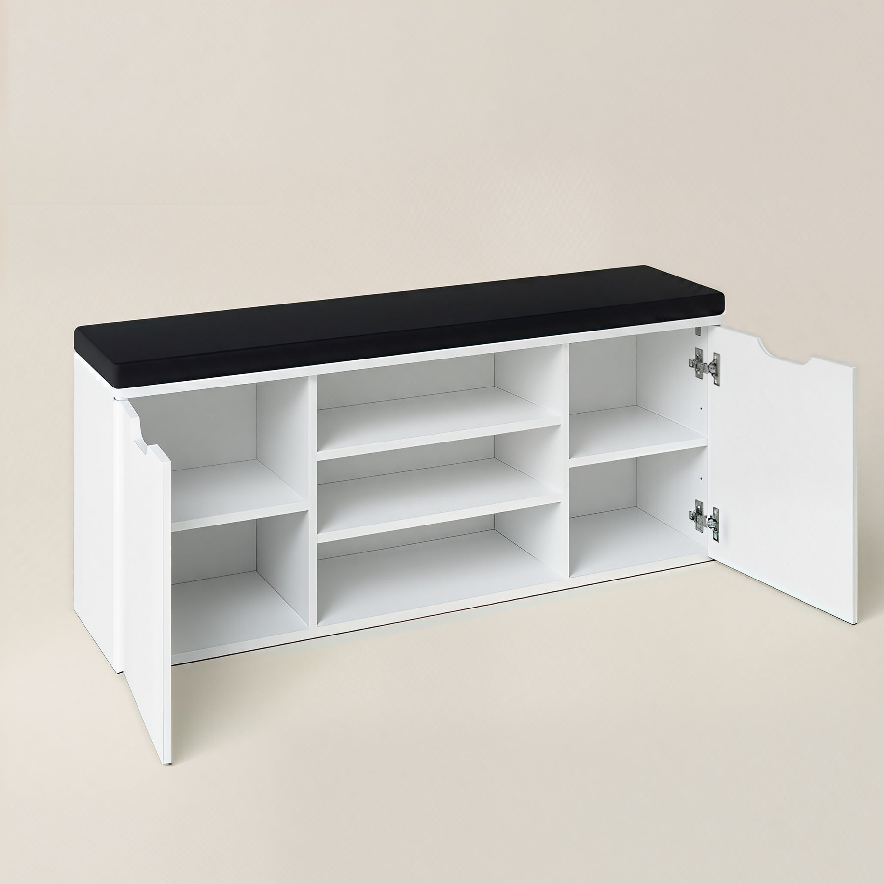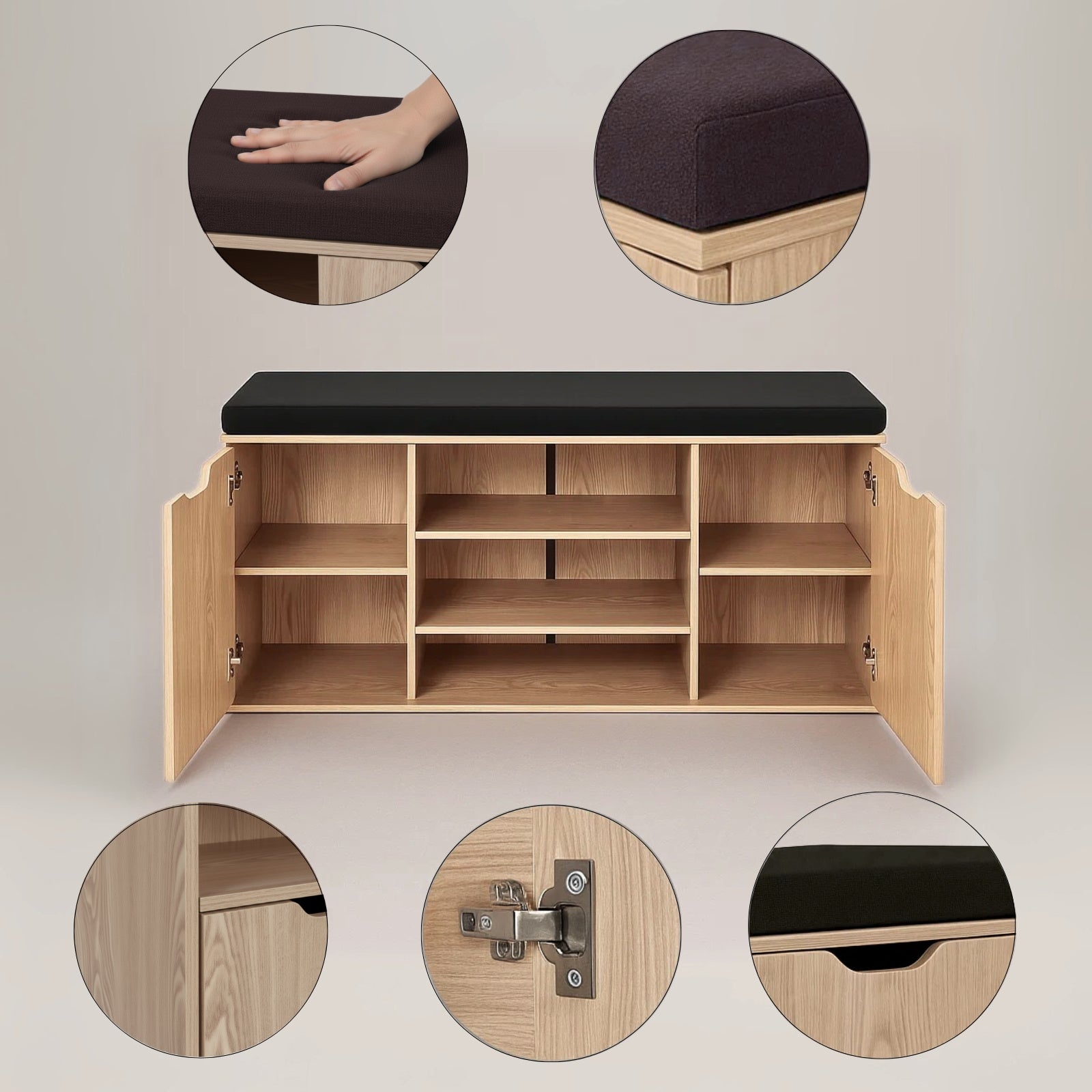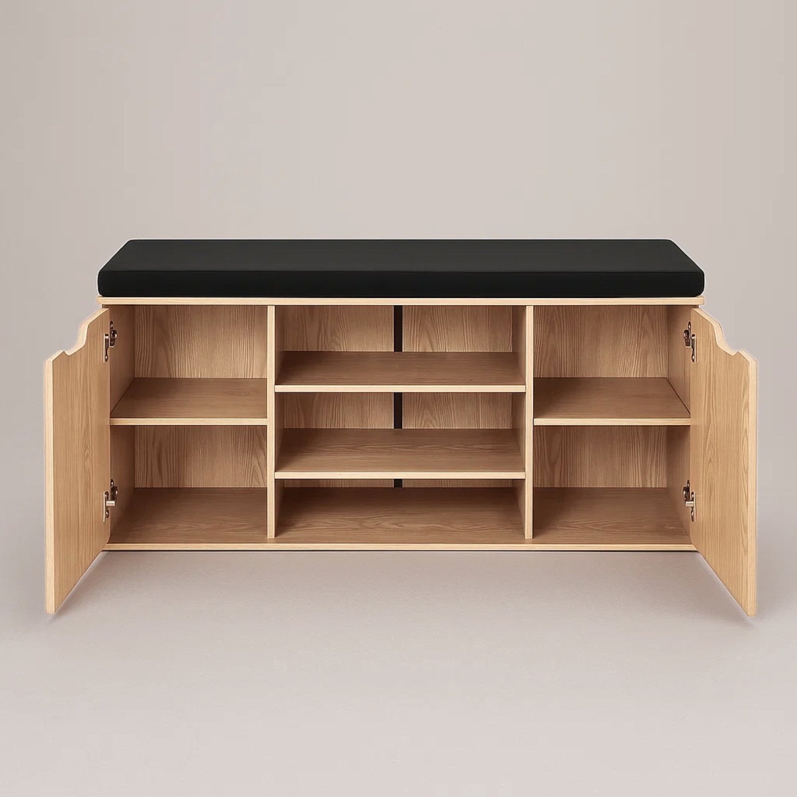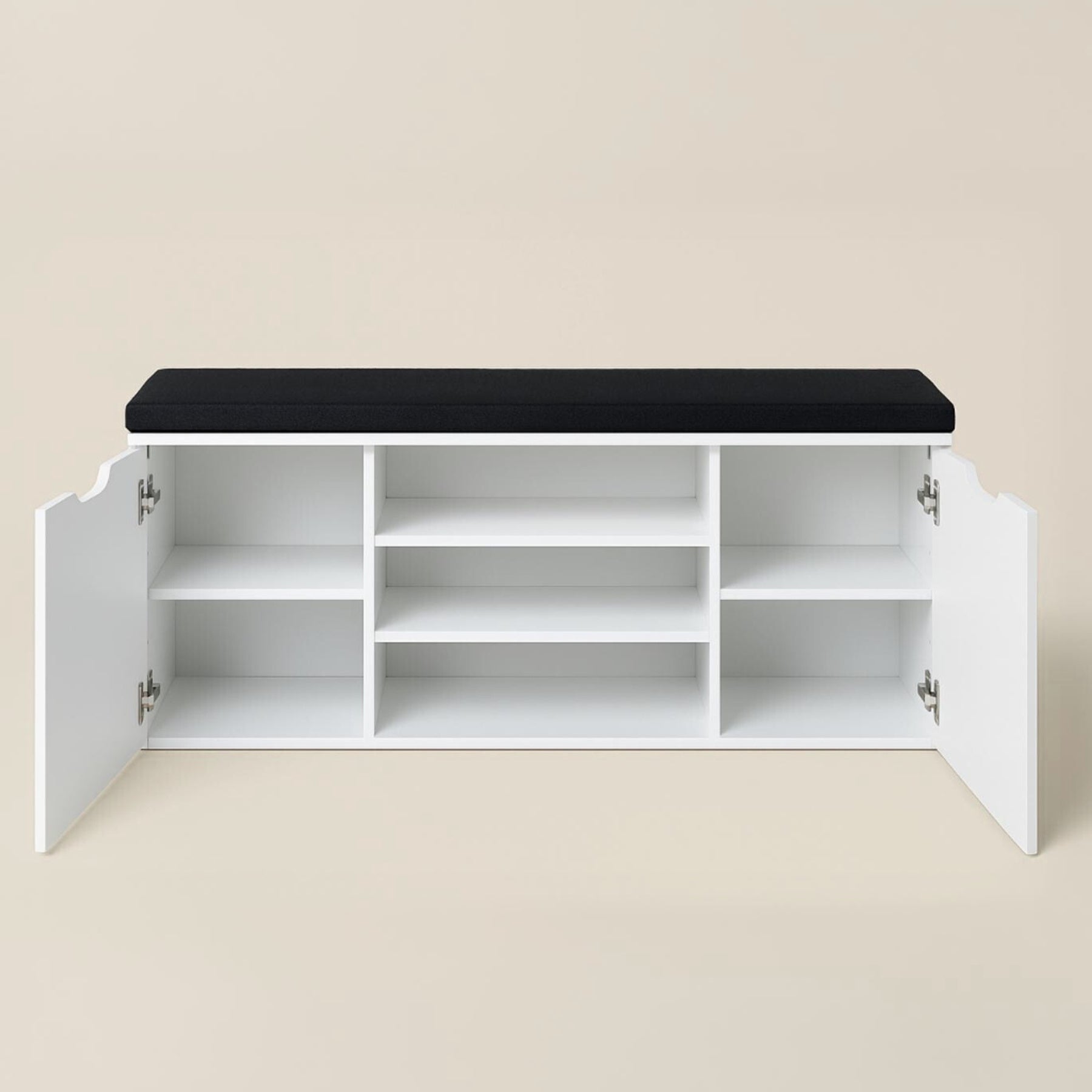 - Wielofunkcyjna konstrukcja: Otwarte półki i zamknięty schowek pomieszczą do 15 par butów, a różne wysokości półek (12–20 cm) ułatwią przechowywanie zarówno obuwia codziennego, jak i bardziej eleganckiego.