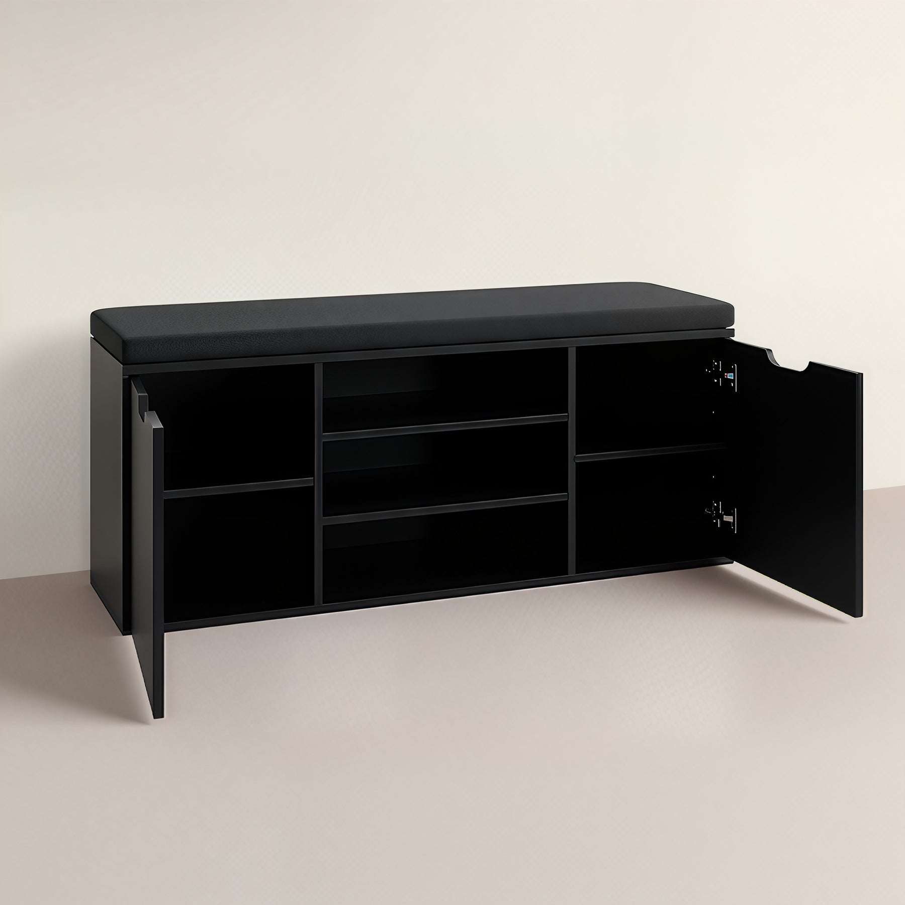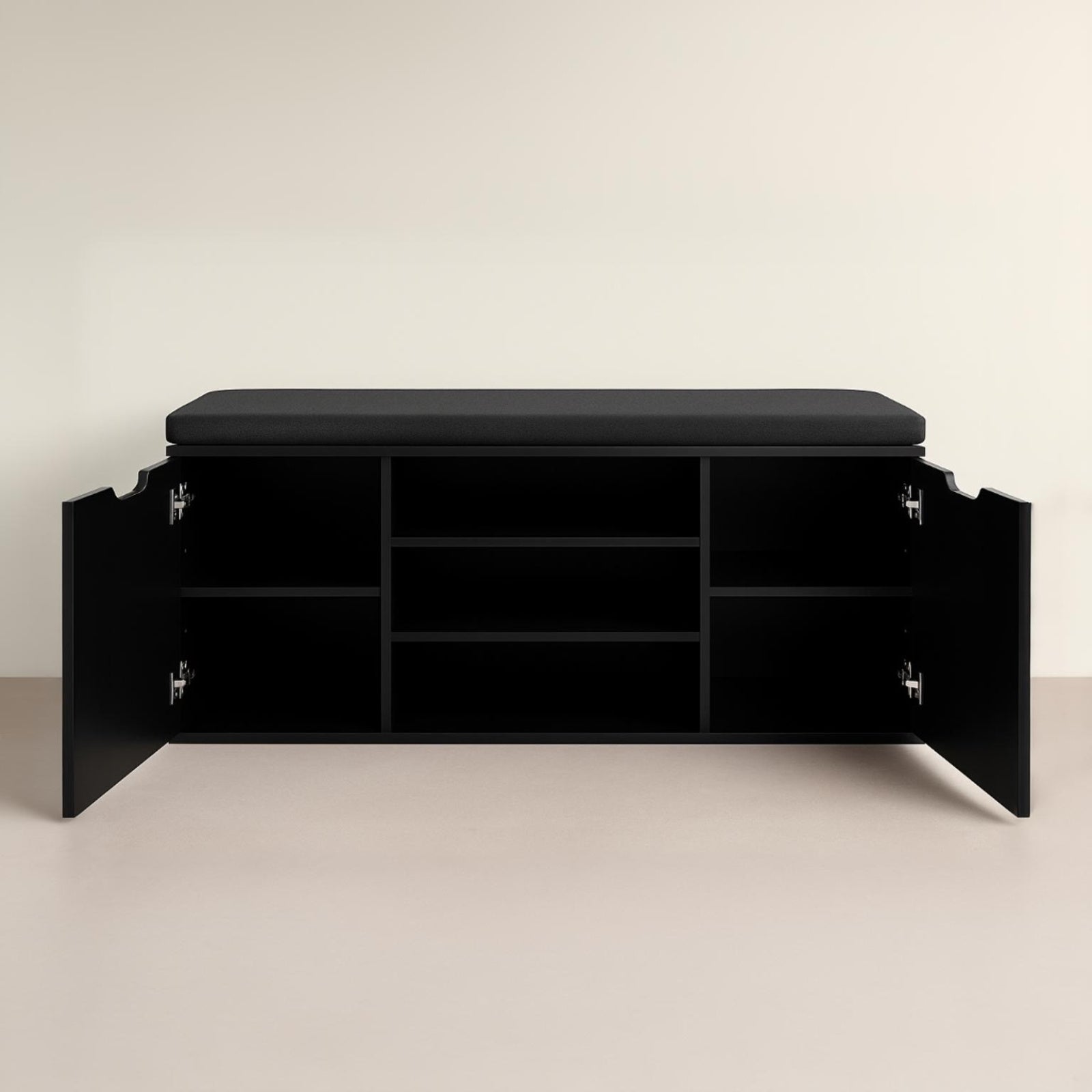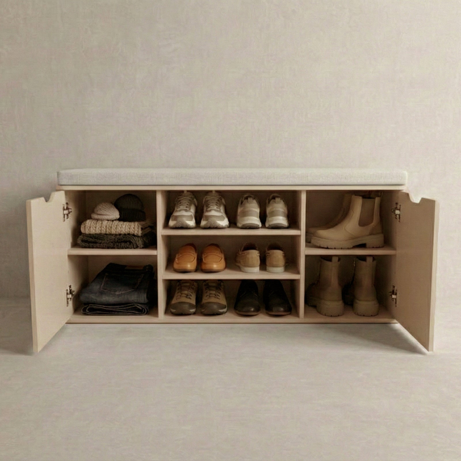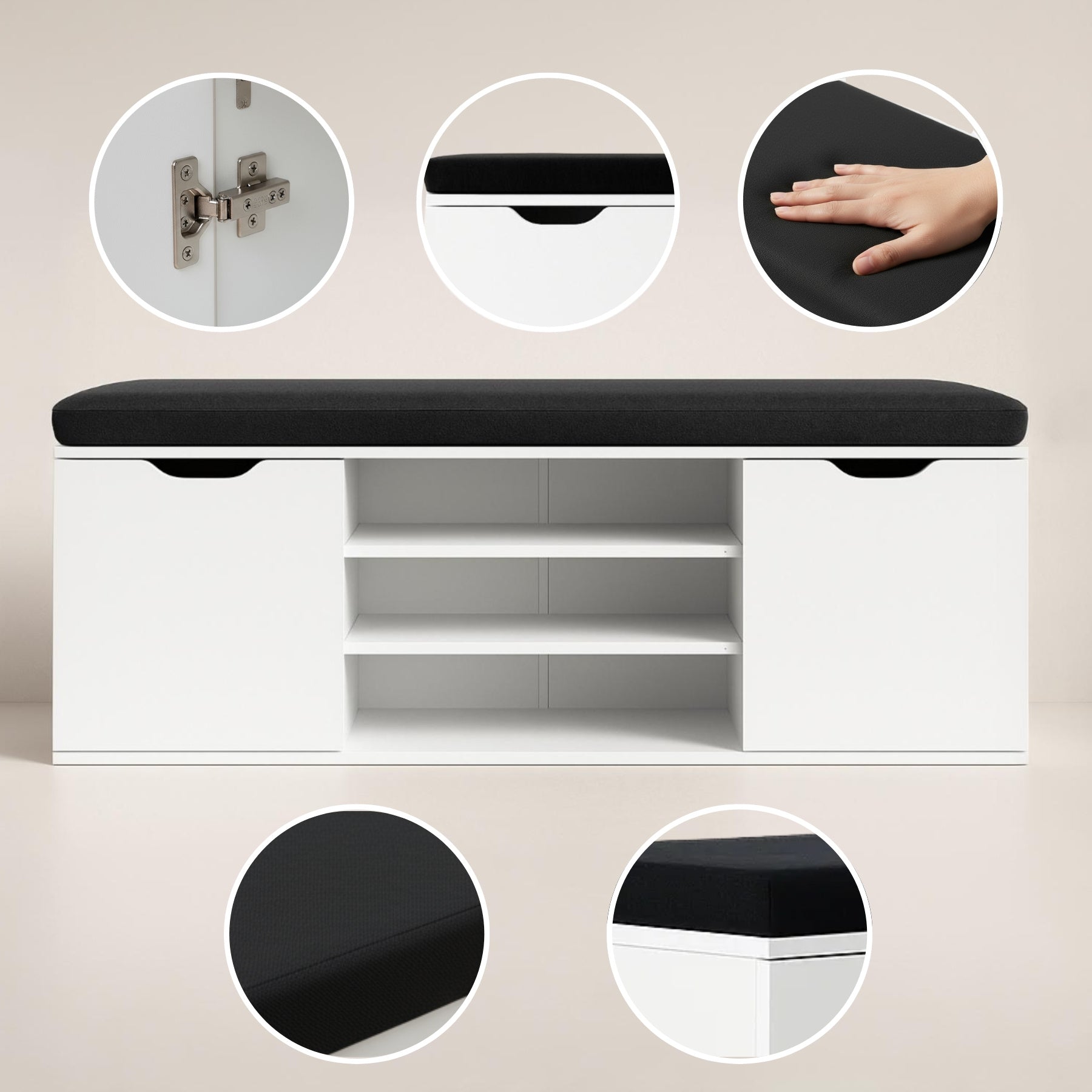 - Wielofunkcyjna konstrukcja: Otwarte półki i zamknięty schowek pomieszczą do 15 par butów, a różne wysokości półek (12–20 cm) ułatwią przechowywanie zarówno obuwia codziennego, jak i bardziej eleganckiego.
