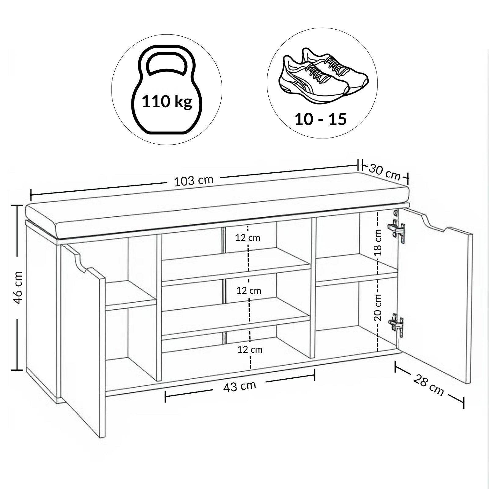 - Praktyczne rozwiązanie do przedpokoju: Kompaktowe wymiary 103 x 30 x 46 cm sprawiają, że szafka PORTA zmieści się nawet w wąskim korytarzu, zapewniając porządek i wygodne miejsce do siedzenia.