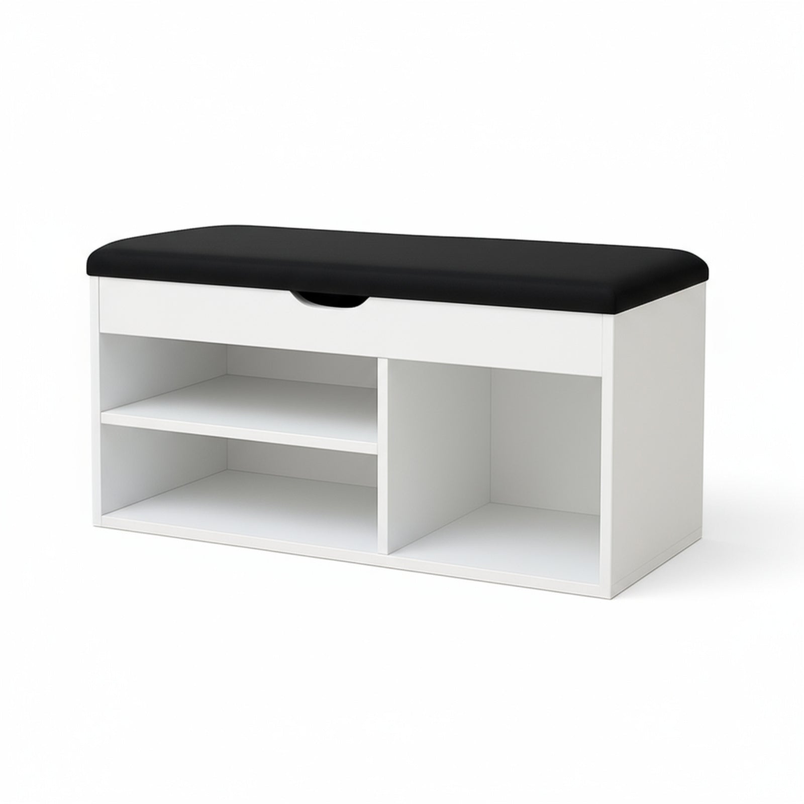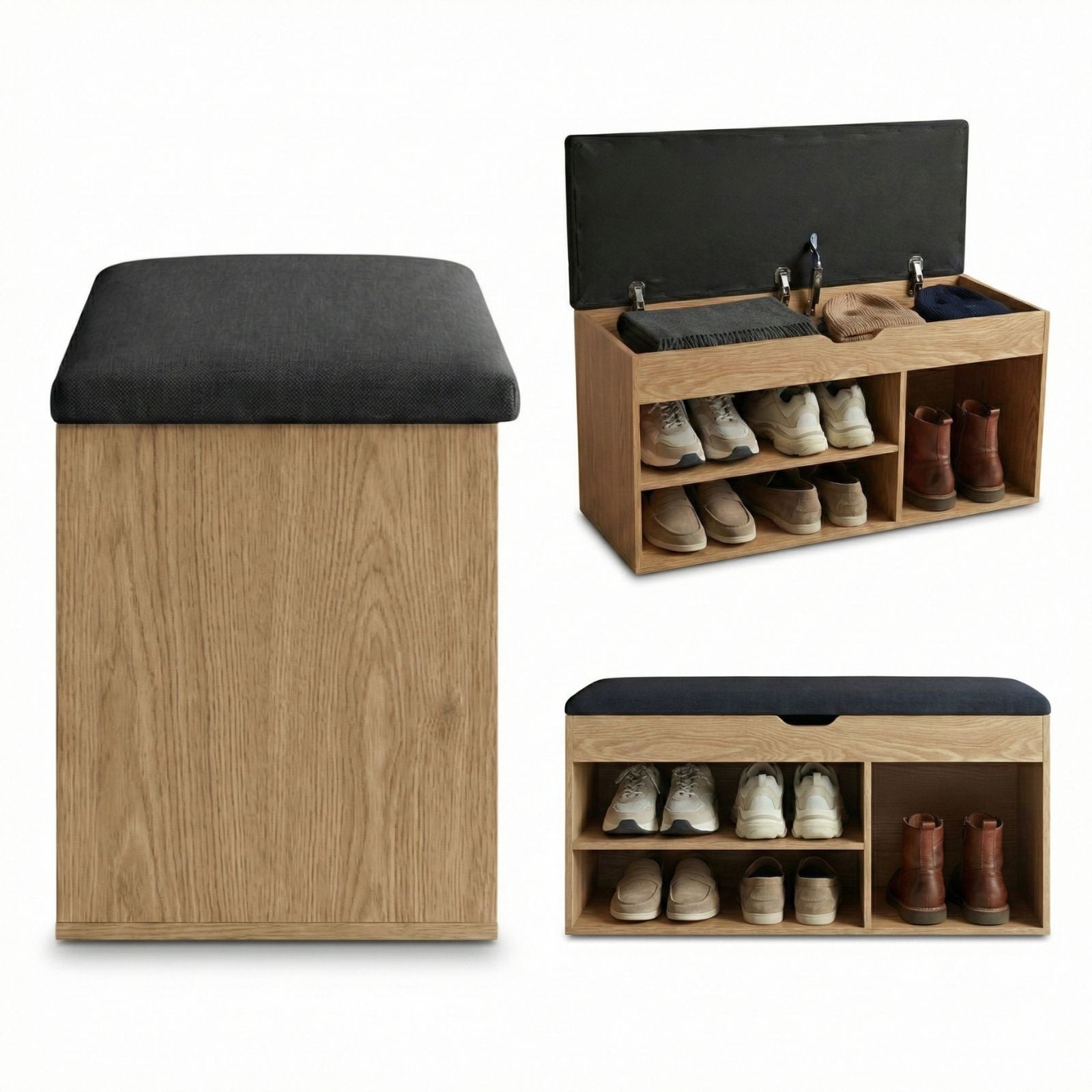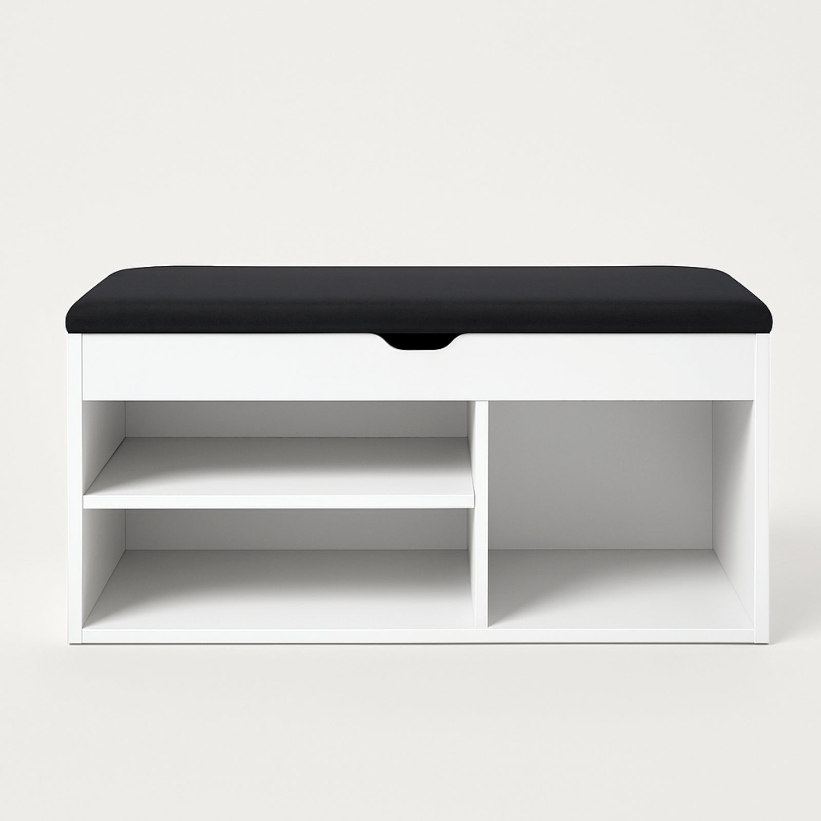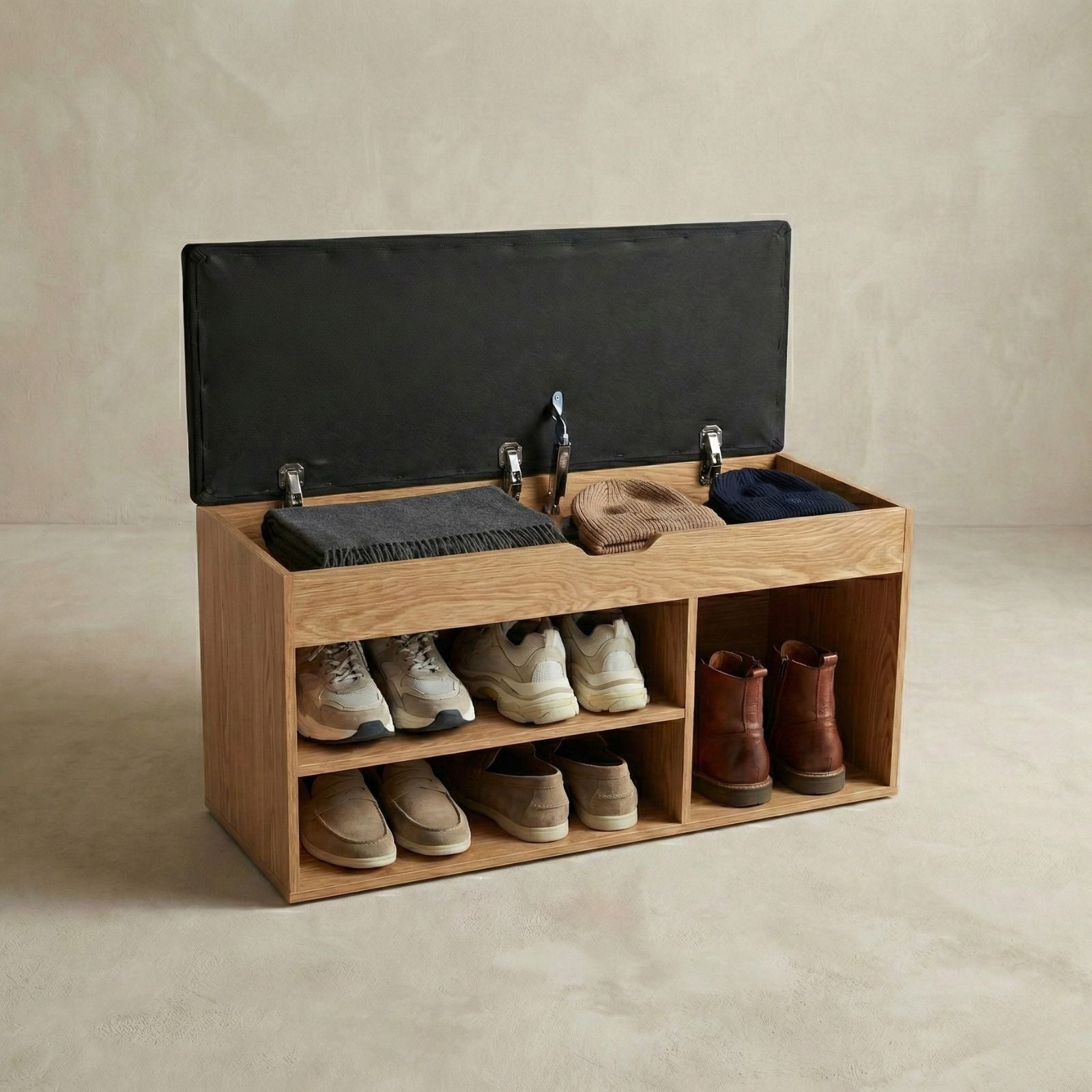 - Inteligentny design: Trzy otwarte półki o różnych wysokościach umożliwiają przechowywanie butów o zróżnicowanych rozmiarach. Górny schowek z mechanizmem cichego domykania doskonale nadaje się na drobne akcesoria.