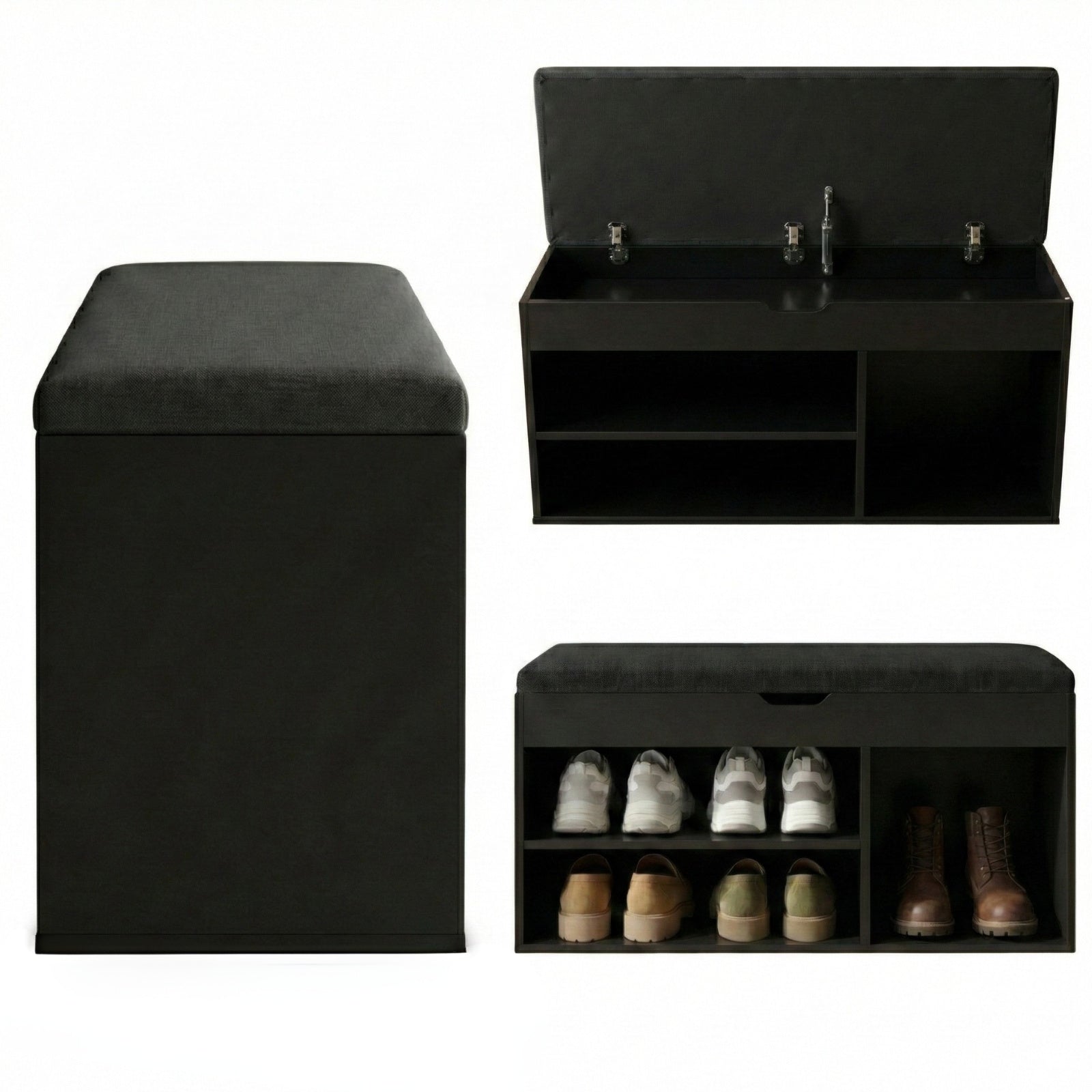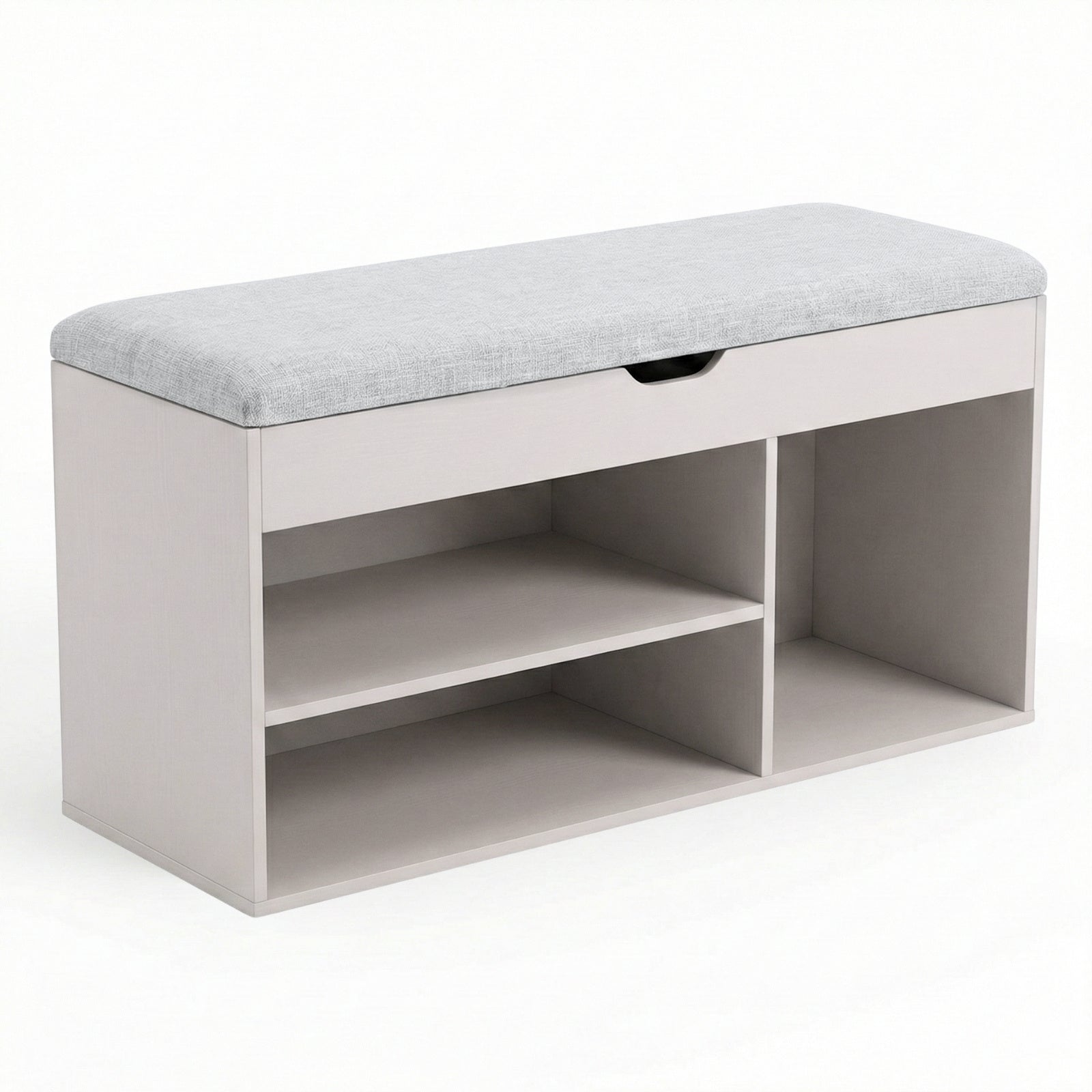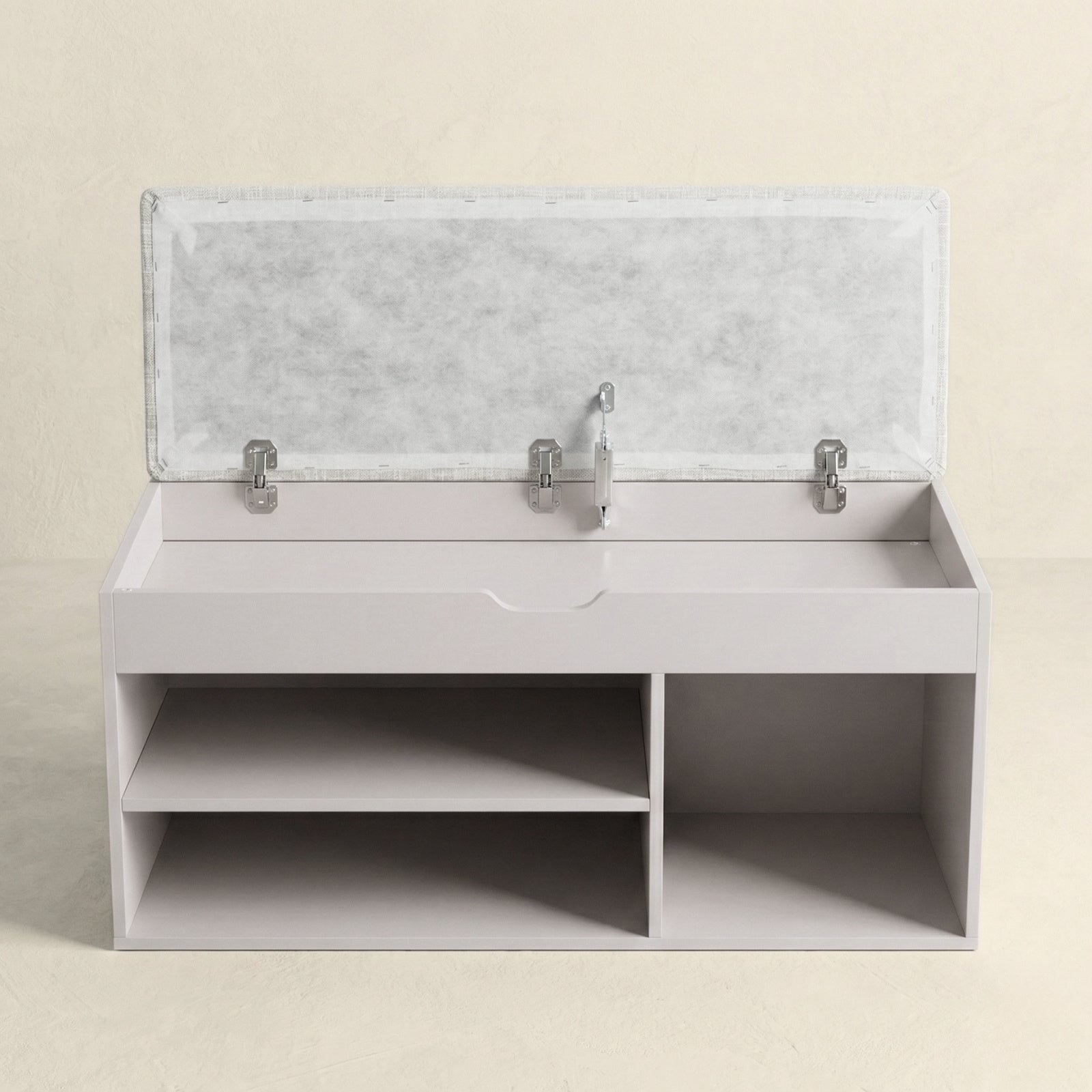 - Inteligentny design: Trzy otwarte półki o różnych wysokościach umożliwiają przechowywanie butów o zróżnicowanych rozmiarach. Górny schowek z mechanizmem cichego domykania doskonale nadaje się na drobne akcesoria.