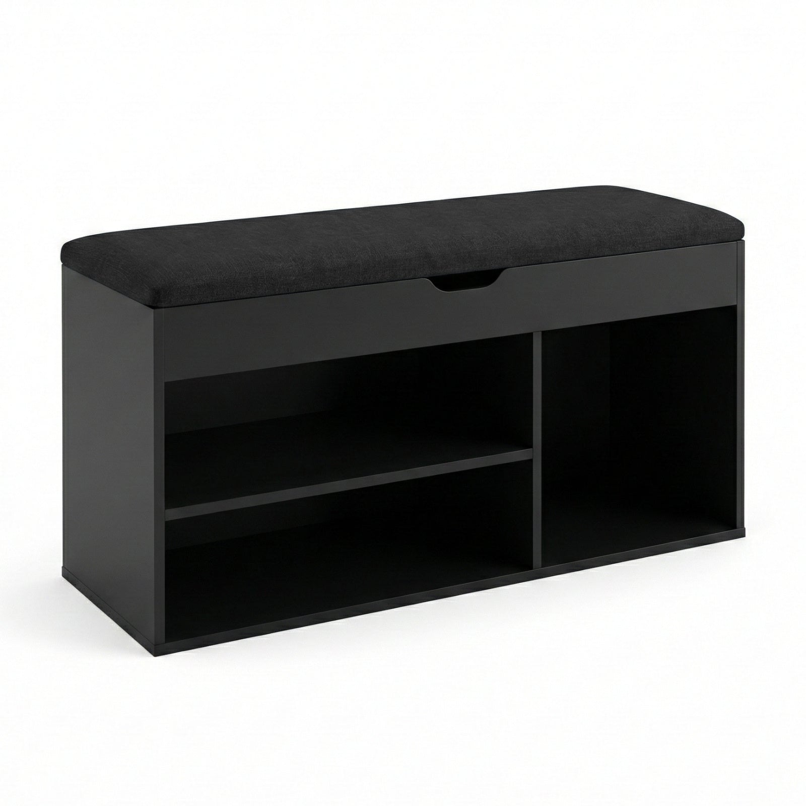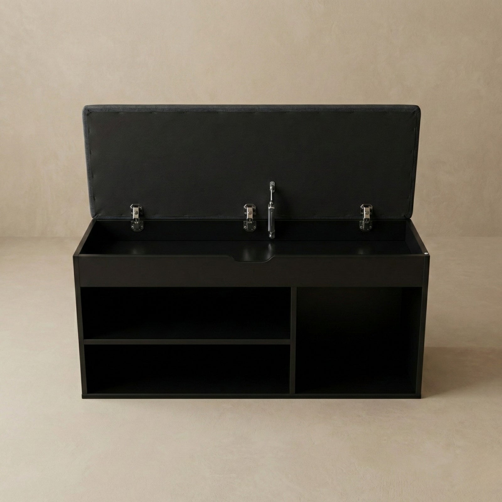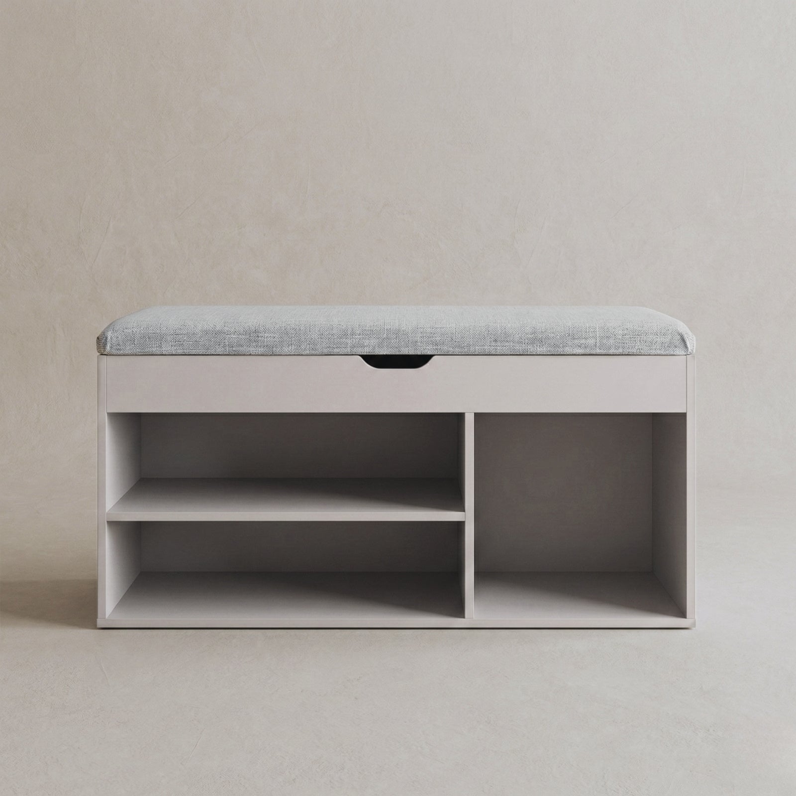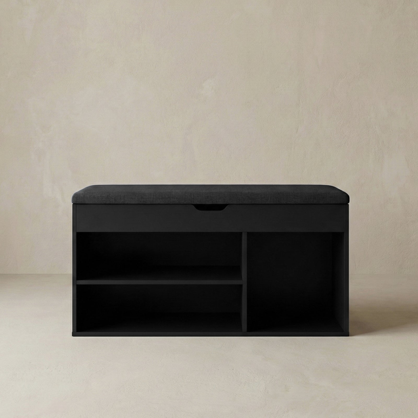- Inteligentny design: Trzy otwarte półki o różnych wysokościach umożliwiają przechowywanie butów o zróżnicowanych rozmiarach. Górny schowek z mechanizmem cichego domykania doskonale nadaje się na drobne akcesoria.