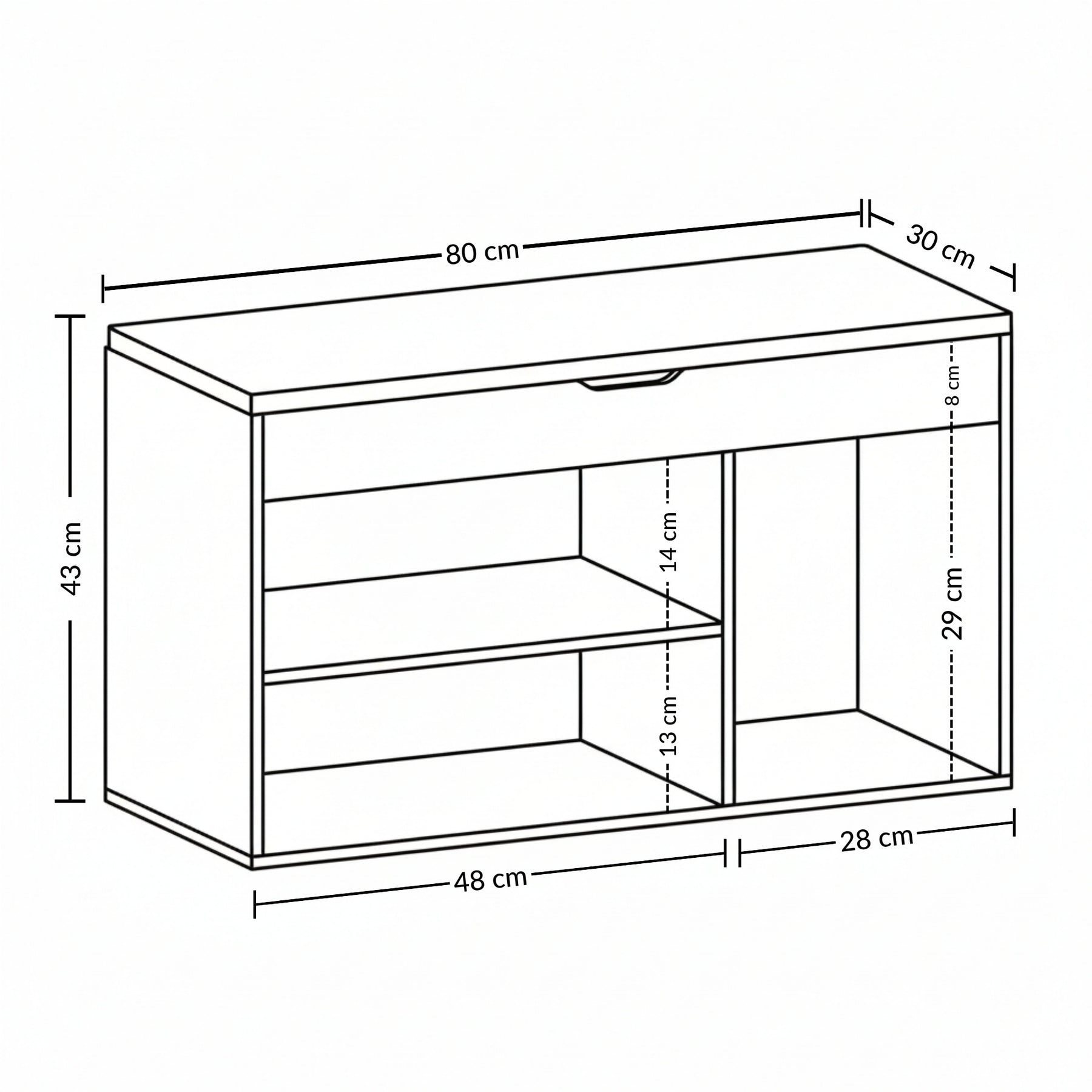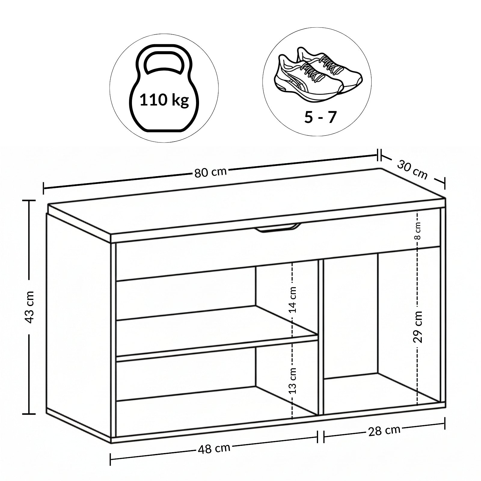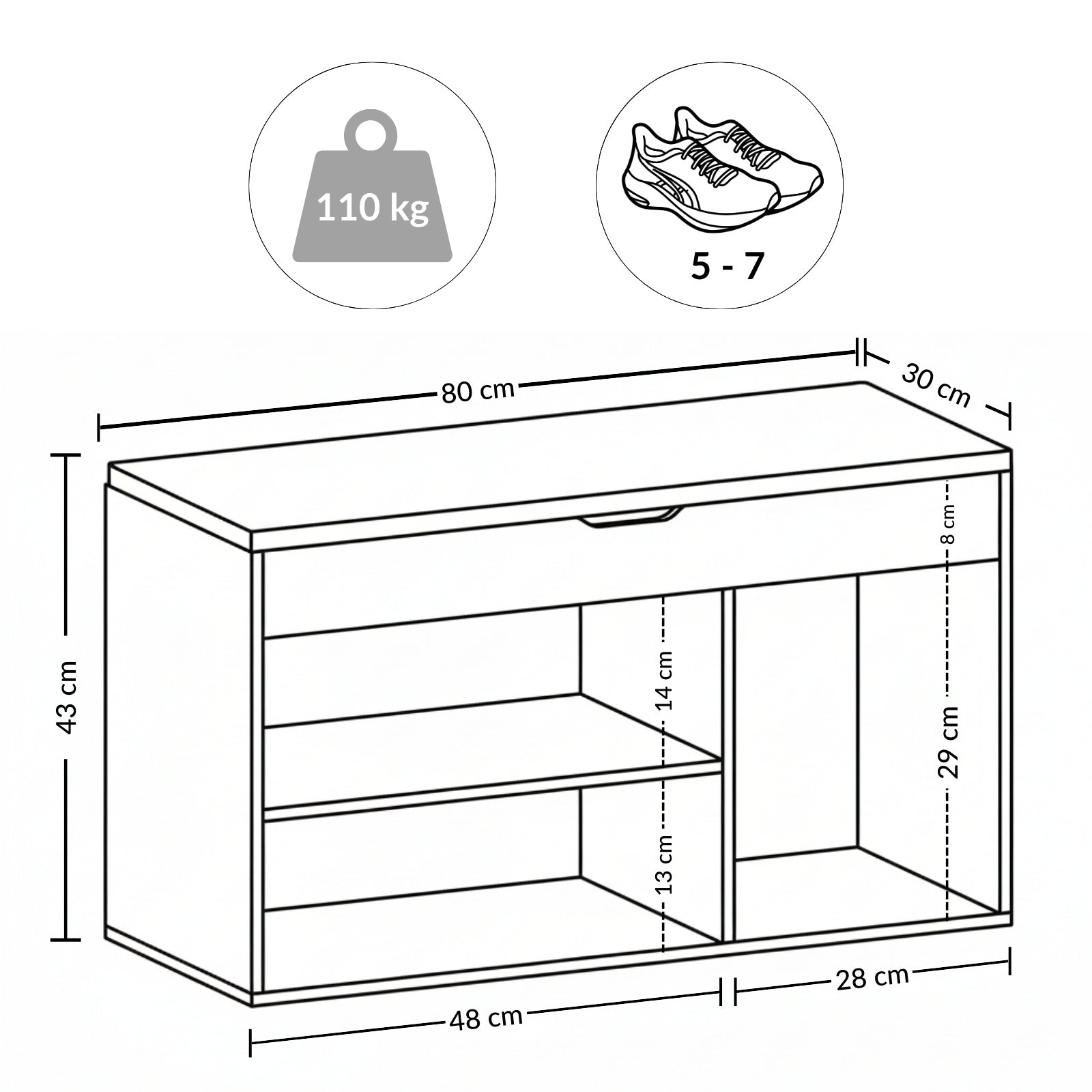 - Praktyczne rozwiązanie do przechowywania: Szafka na buty z siedziskiem TRIA to idealne połączenie funkcjonalności i stylu, które pomoże utrzymać porządek w przedpokoju. Dzięki wymiarom 80 x 43 x 30 cm, zmieści się w każdej przestrzeni, oferując jednocześnie miejsce na 6 par butów.
