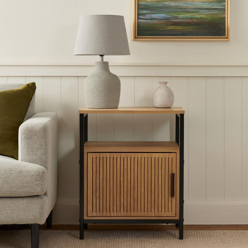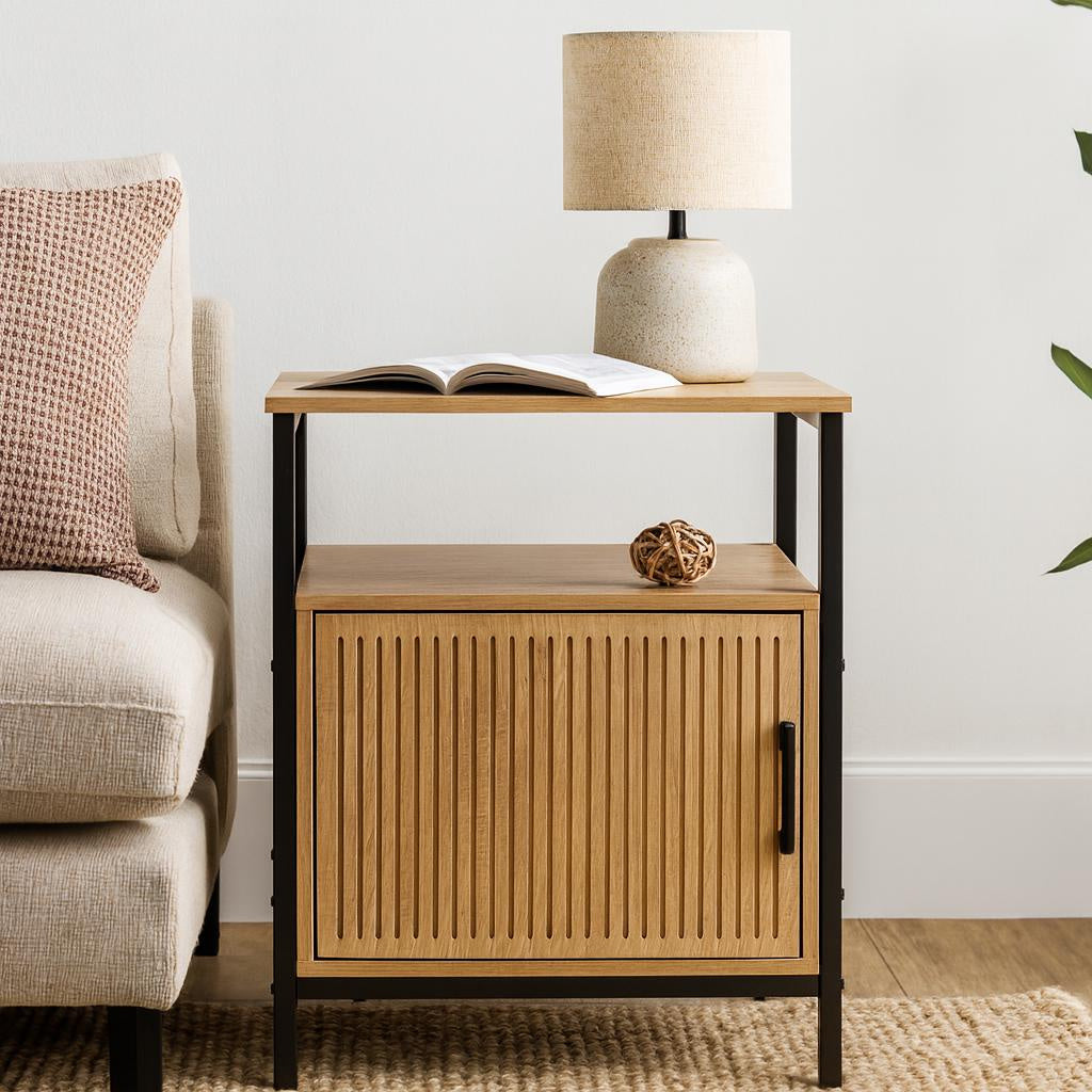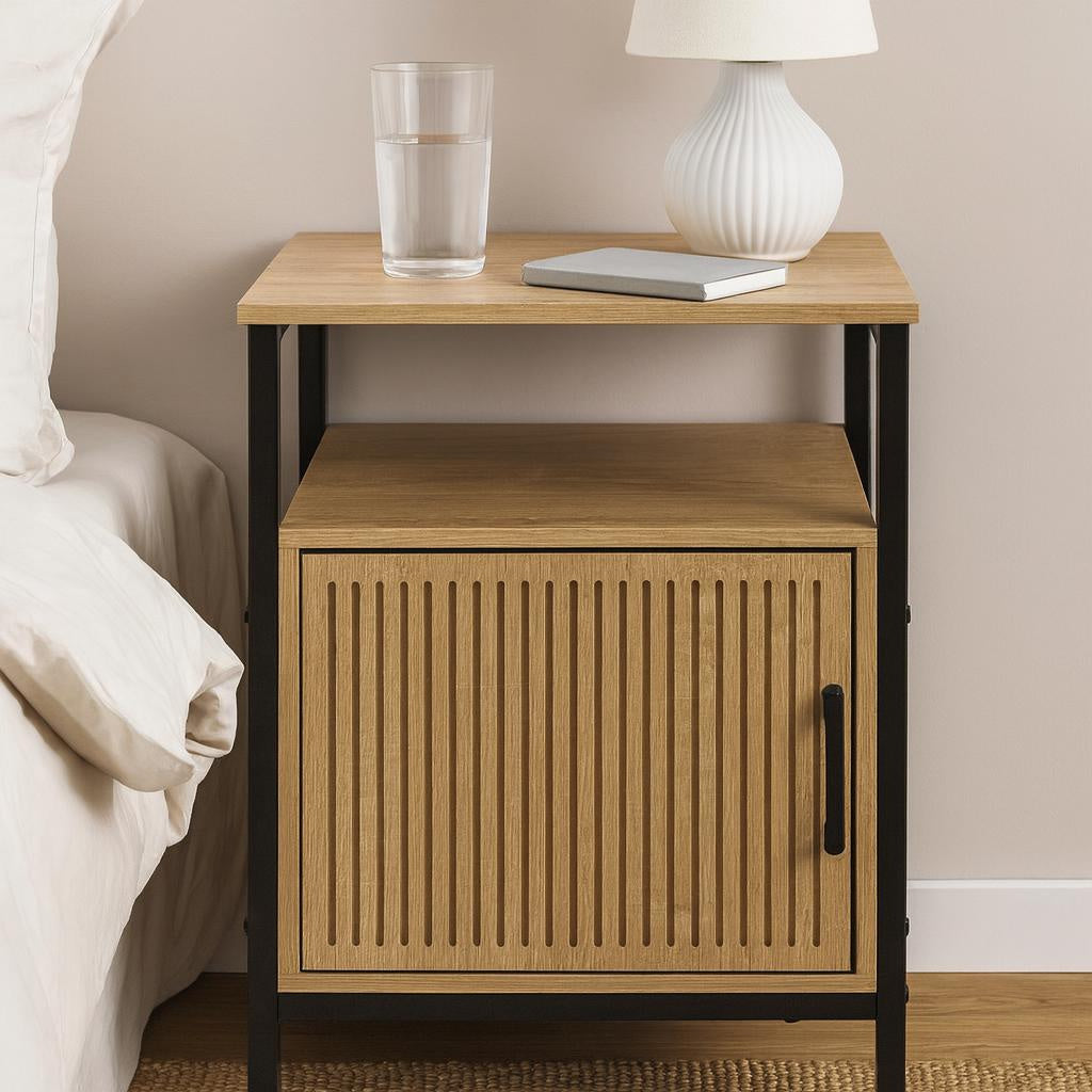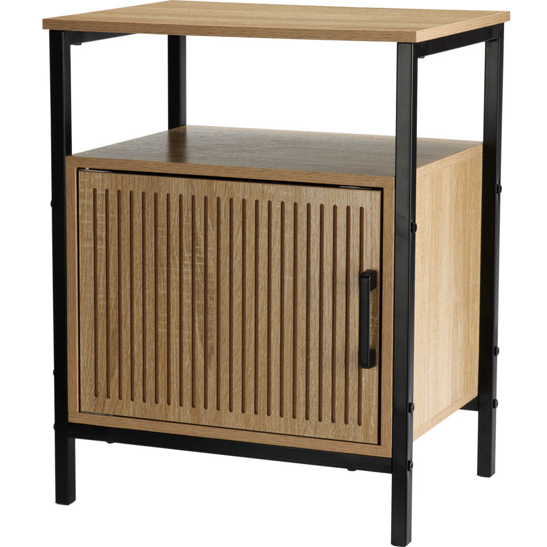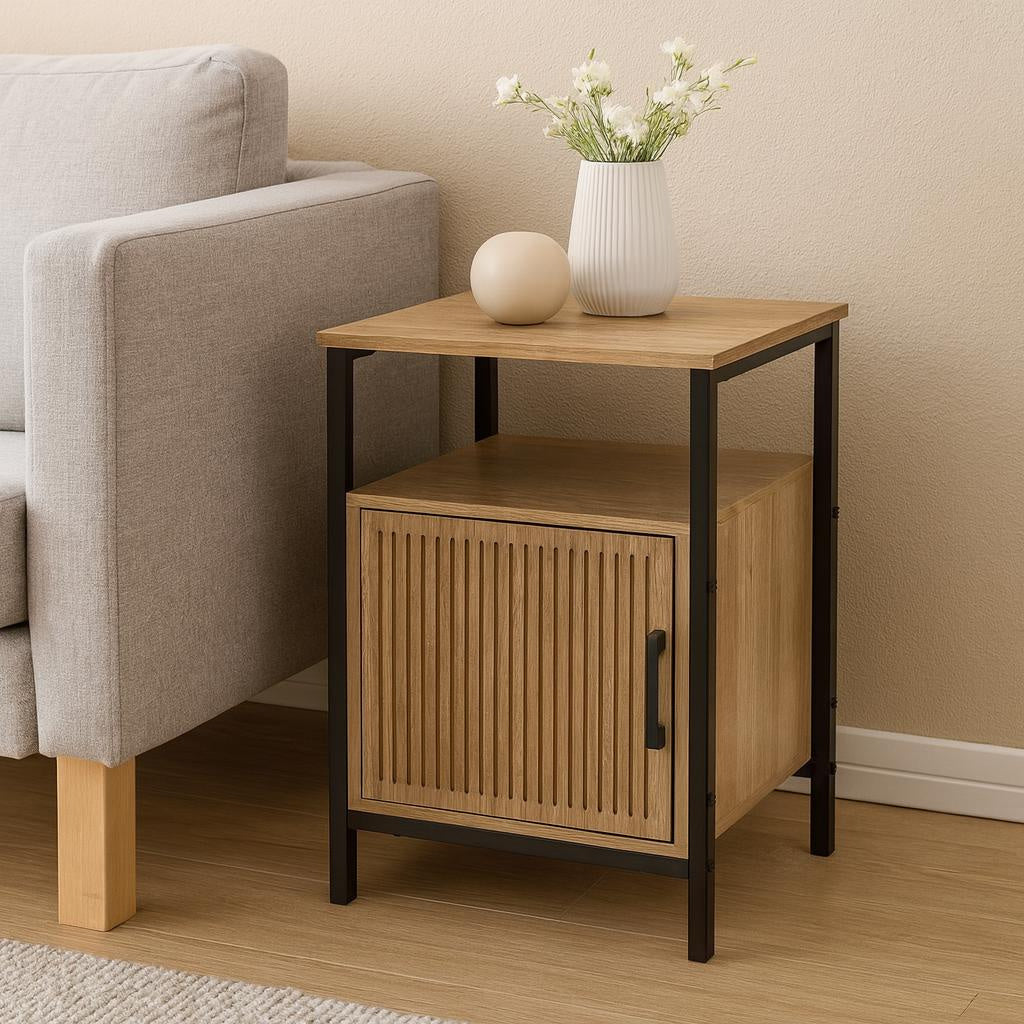 - Stylowy design: Naturalne wykończenie frontu w połączeniu z czarną metalową ramą nadaje szafce nowoczesny i elegancki wygląd, który wzbogaci każde wnętrze.