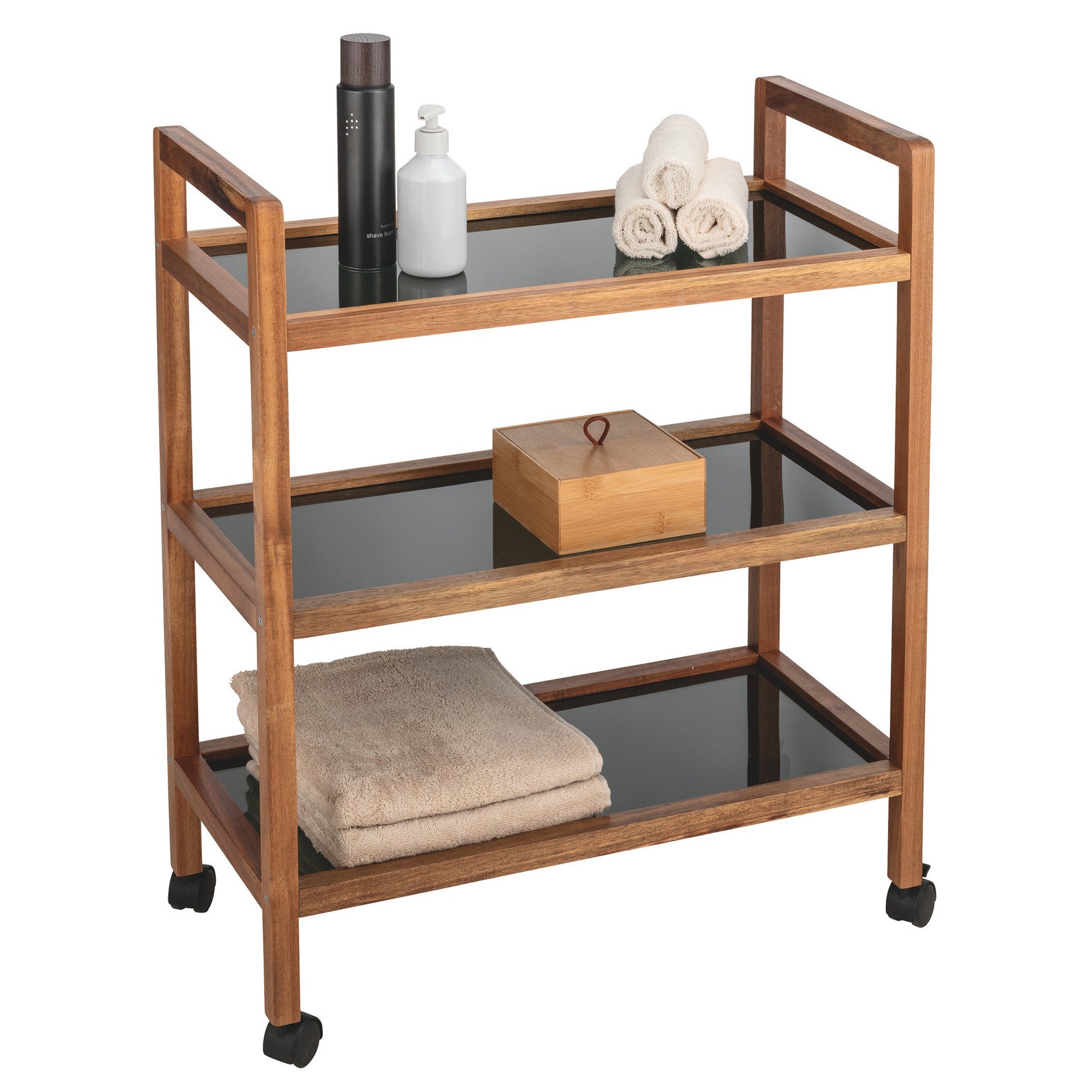 Regał FONDI z drewna akacji z mobilnymi półkami szklanymi - Wysoka jakość materiałów zapewniająca trwałość i stabilność