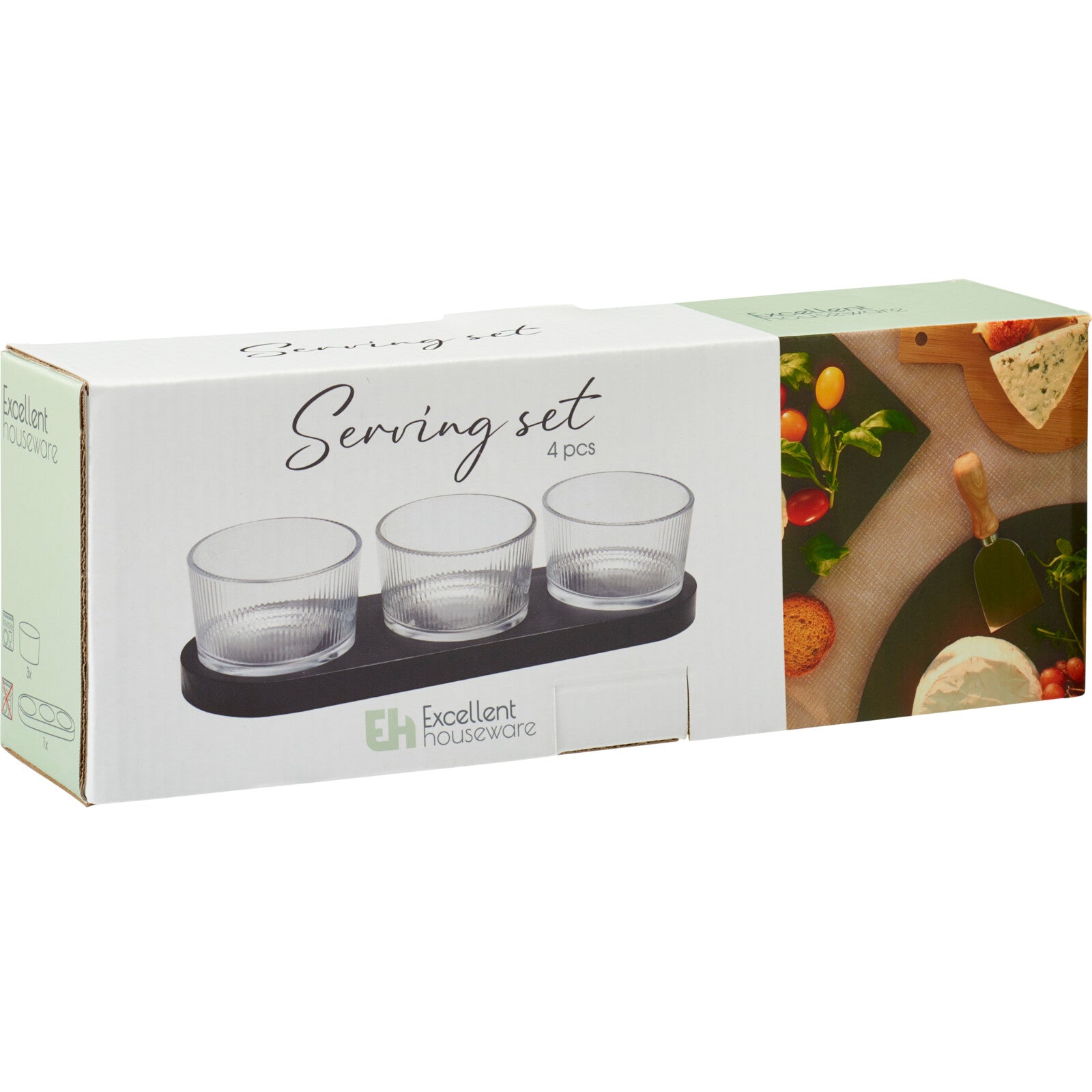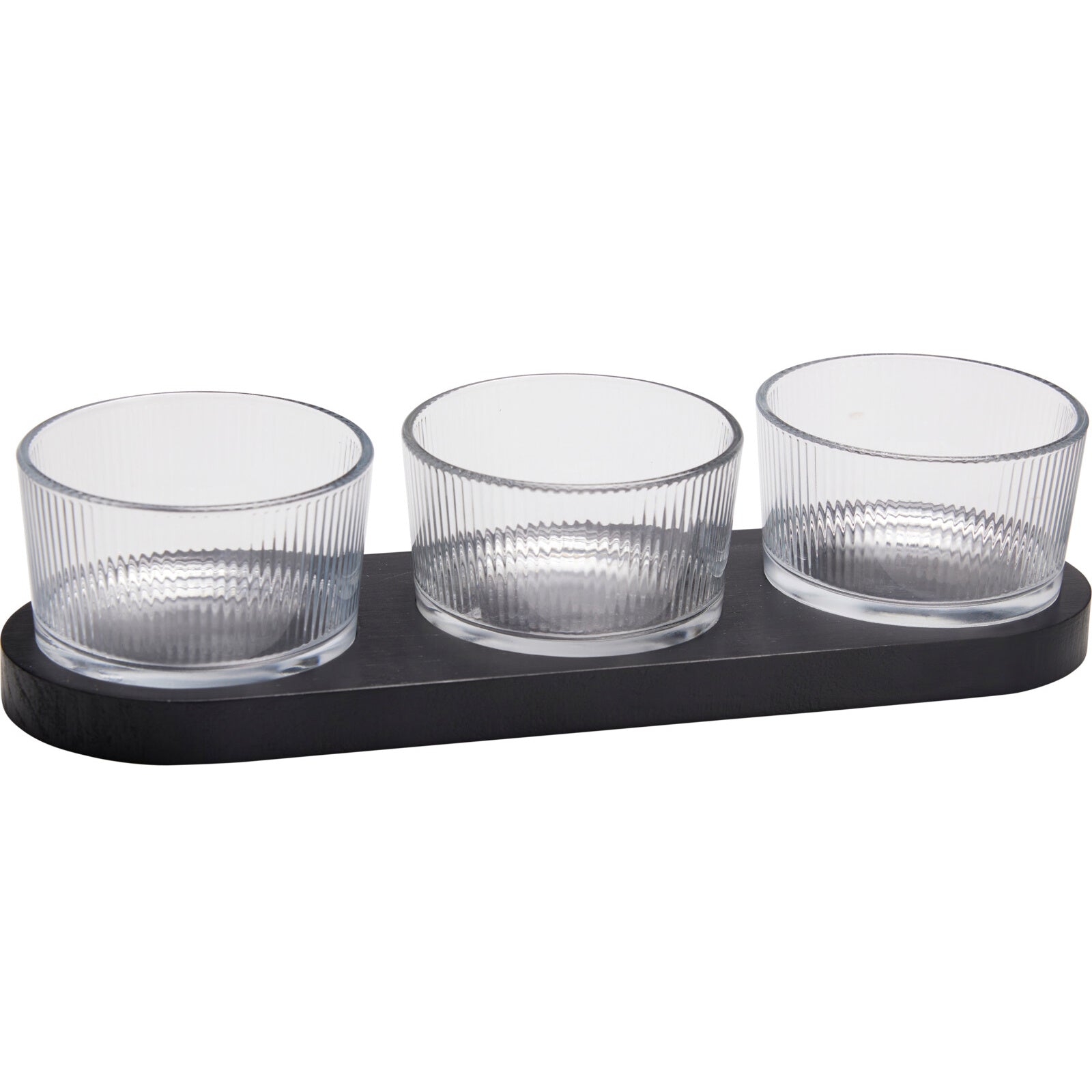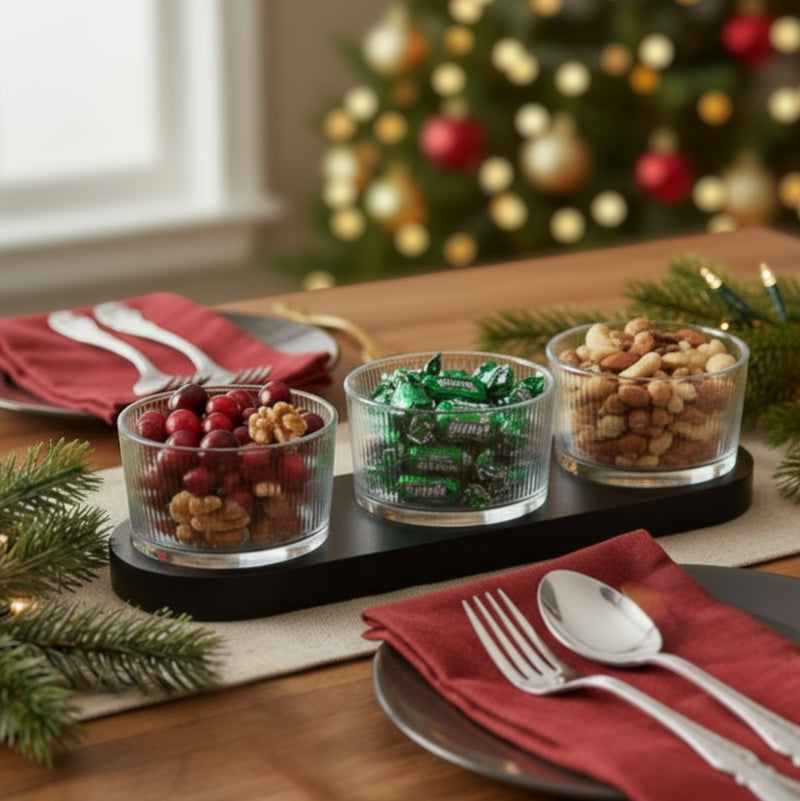 - Praktyczne wymiary: Zestaw składa się z trzech miseczek o średnicy 9 cm, co czyni je idealnymi do serwowania różnorodnych przekąsek, od orzechów po słodycze. Całkowite wymiary podstawki wynoszą 30 x 10 x 1,5 cm, co sprawia, że zestaw jest kompaktowy i łatwy do przechowywania.