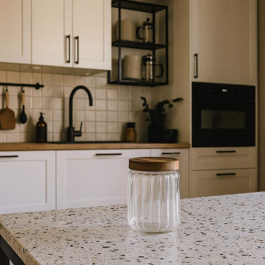 - Wysokiej jakości materiały: Wykonany z trwałego szkła borokrzemowego, pojemnik jest odporny na wysokie temperatury i uszkodzenia. Drewniana pokrywka z naturalnego drewna akacjowego zapewnia doskonałe uszczelnienie, co chroni przechowywane produkty przed wilgocią.