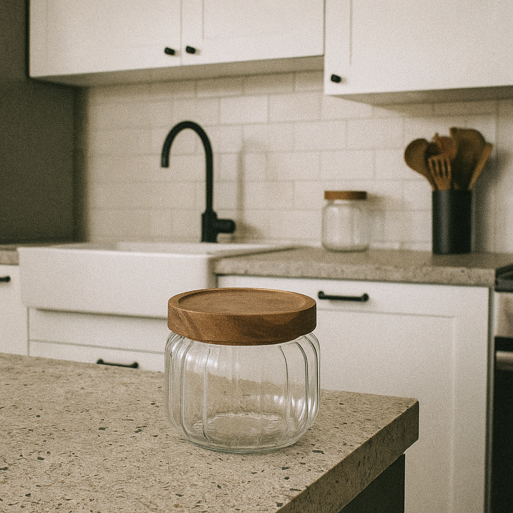 - Łatwe czyszczenie: Pojemnik jest przeznaczony do mycia ręcznego, co ułatwia jego pielęgnację. Dzięki gładkiej powierzchni szkła i drewna, wystarczy przetrzeć go wilgotną ściereczką, aby zachować jego estetyczny wygląd.