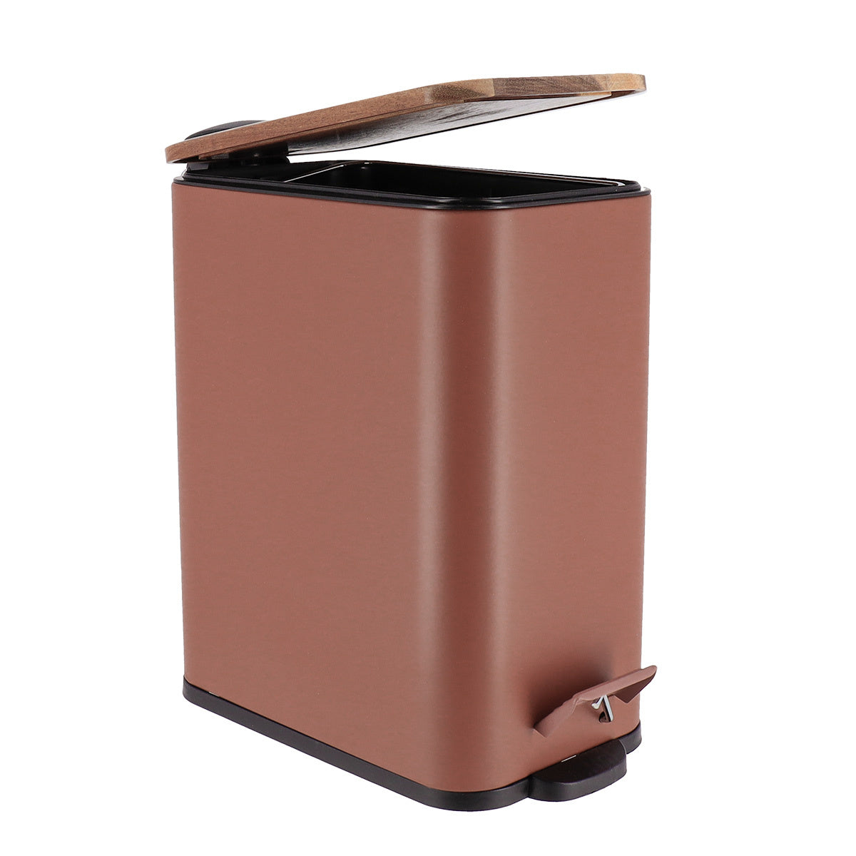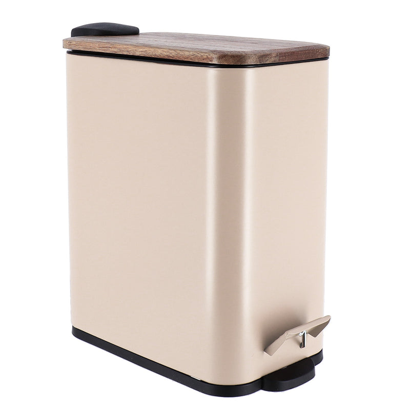 Wąski kosz do śmieci z matowego metalu i drewnianą pokrywą do łazienki 5 l - elegancki i funkcjonalny design idealny do małych przestrzeni