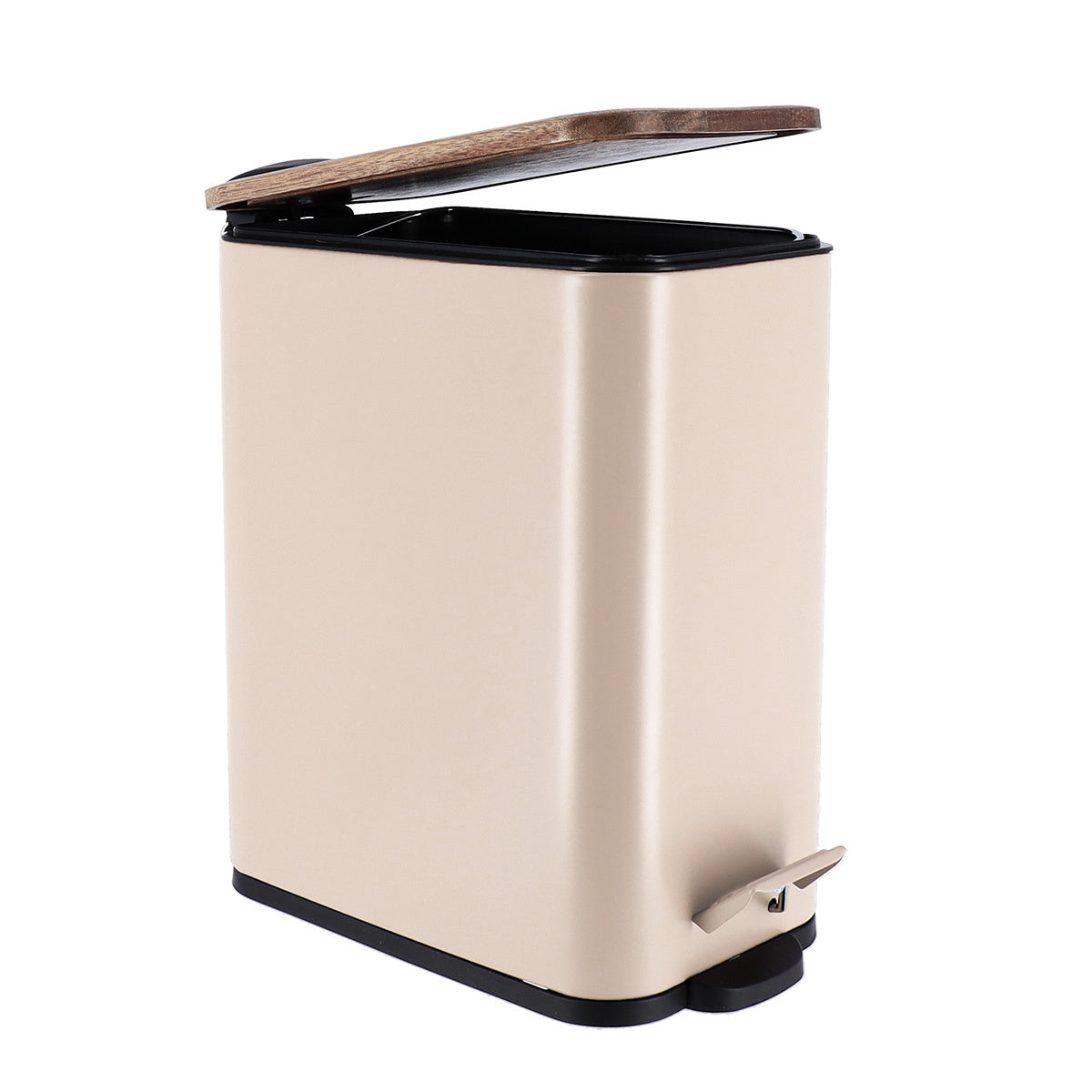 - Wysokiej jakości materiały: Kosz wykonany jest z matowego metalu, co zapewnia trwałość i łatwość w utrzymaniu czystości. Drewniana pokrywa z akacji dodaje elegancji i naturalnego charakteru, harmonizując z różnymi stylami wnętrz.