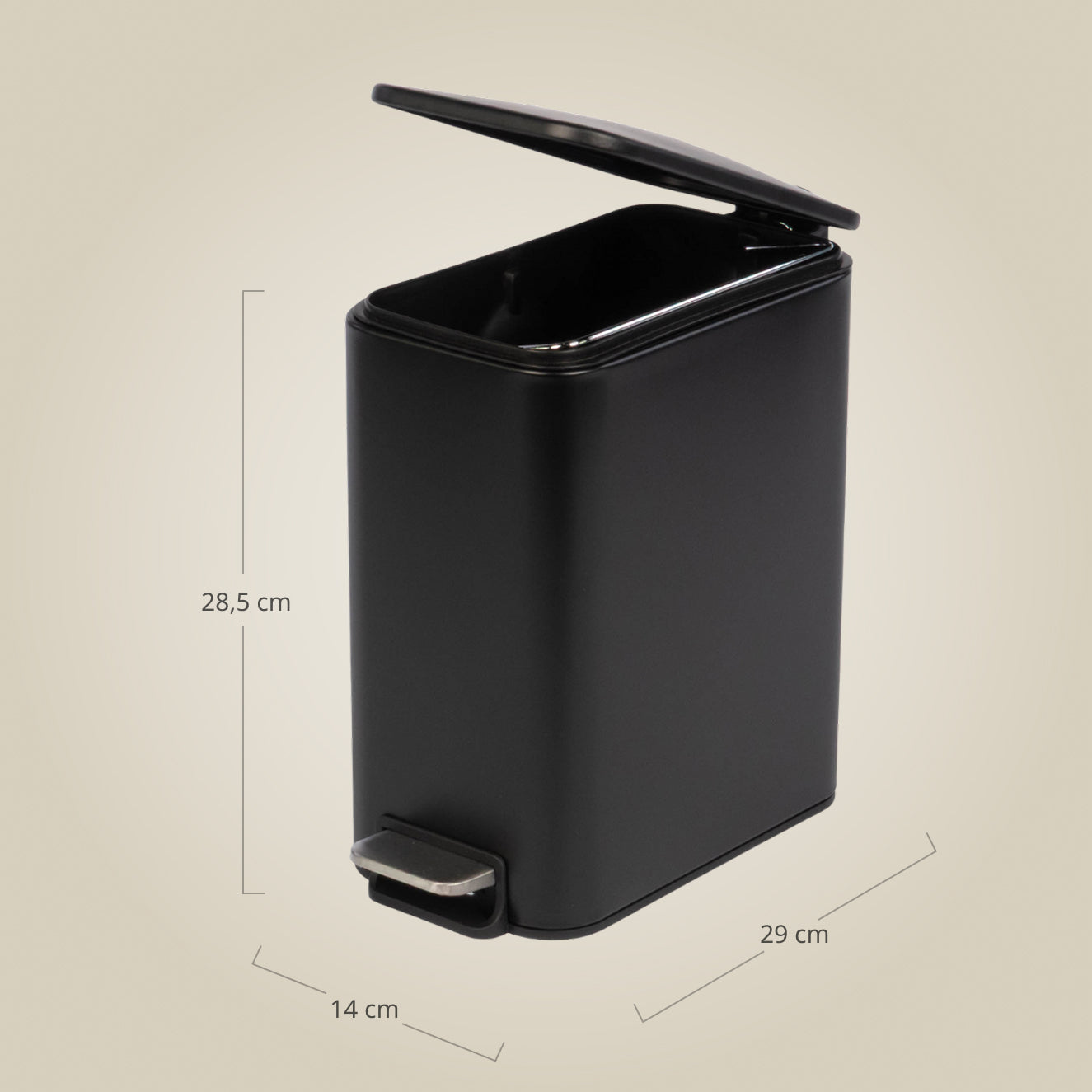 - Praktyczny design: Wąski kosz łazienkowy BALVO o pojemności 5 l idealnie sprawdzi się w mniejszych przestrzeniach, zapewniając wygodne miejsce na odpady. Jego kompaktowe wymiary (29 x 14 x 28,5 cm) pozwalają na łatwe umiejscowienie w każdej łazience.