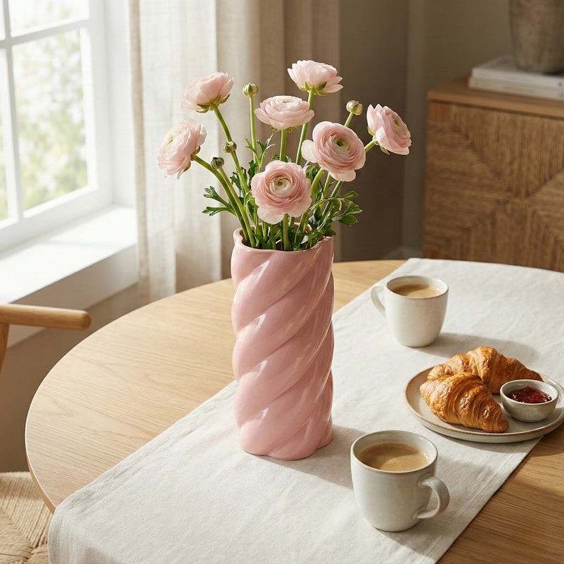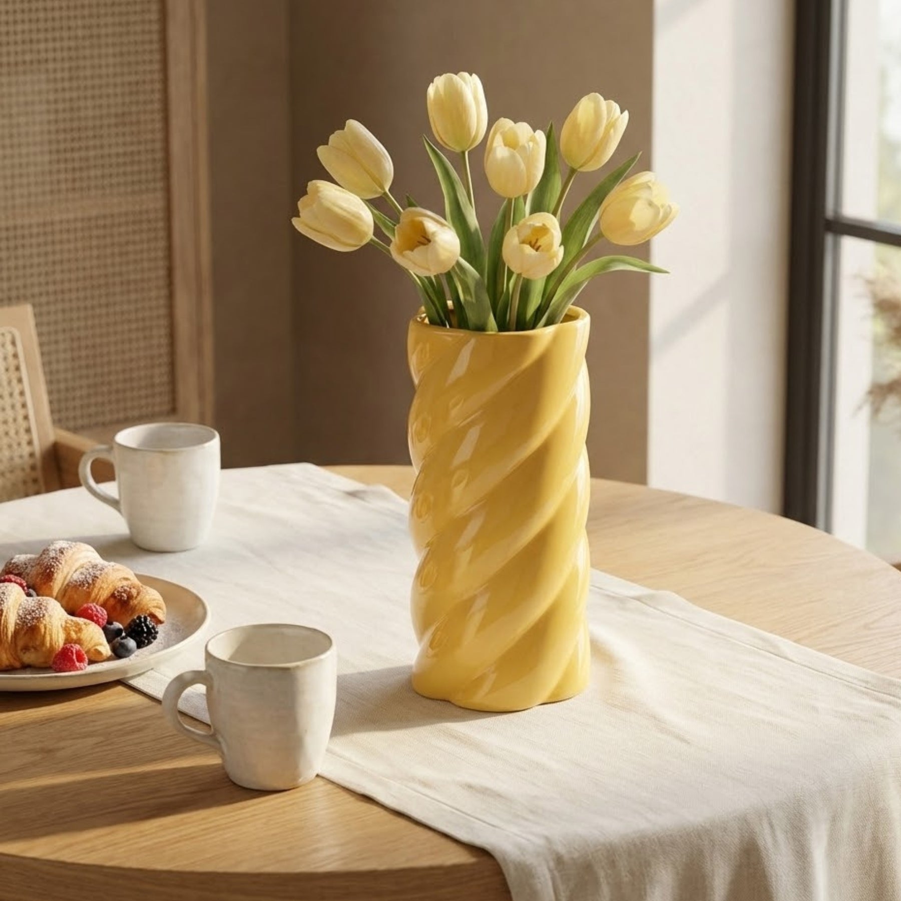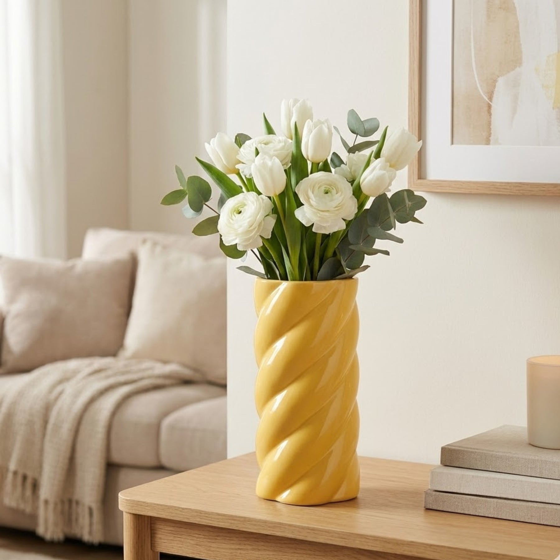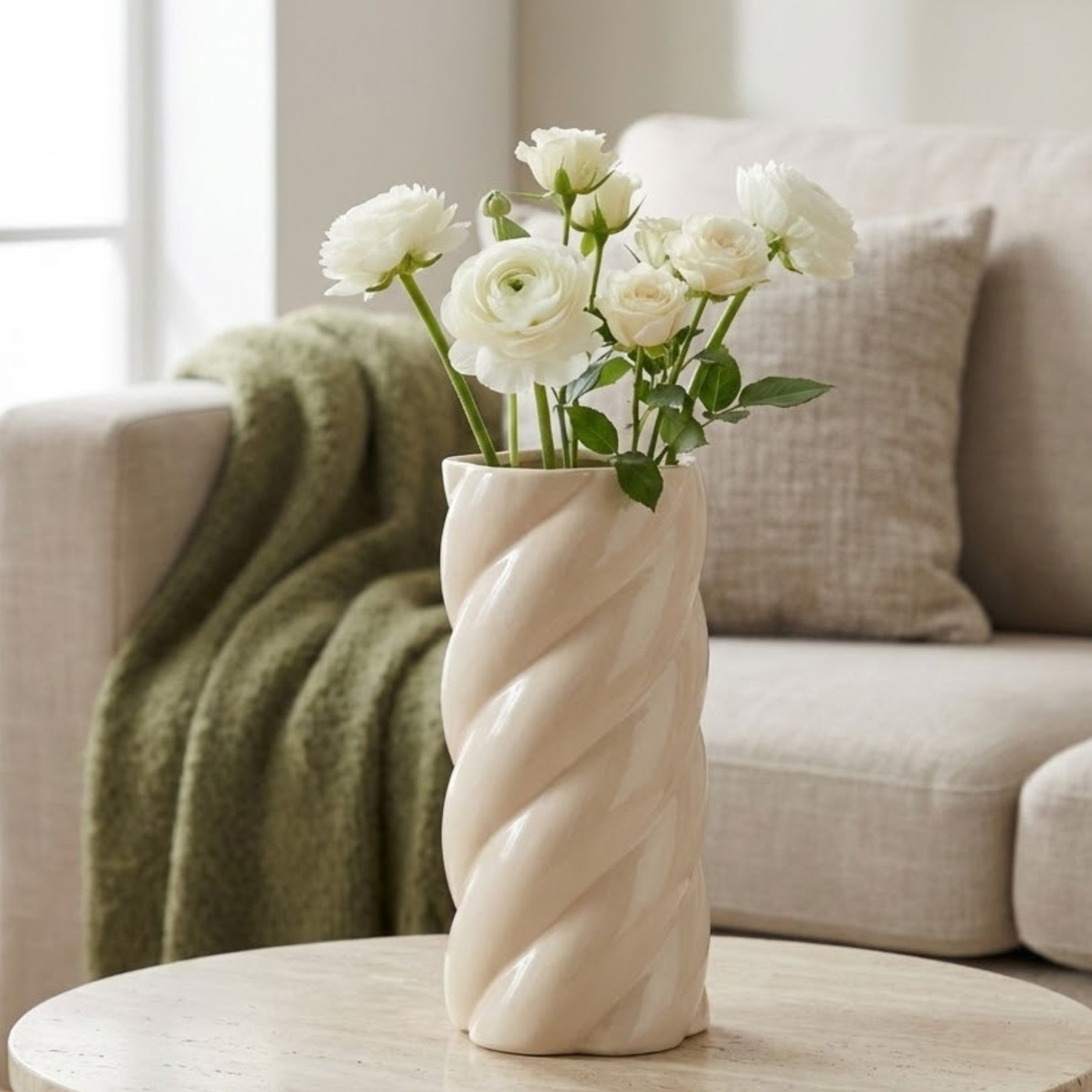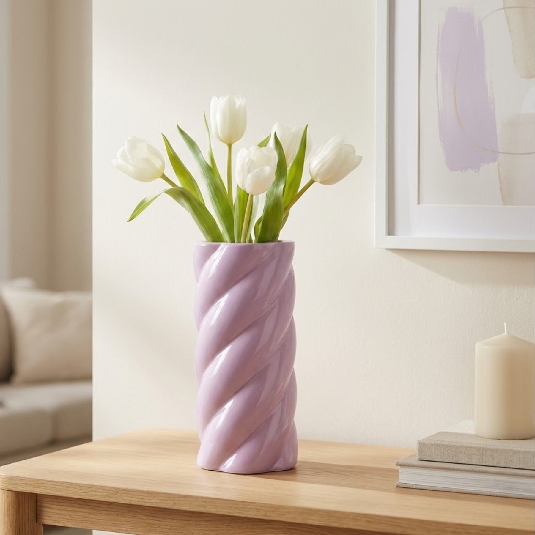 - Elegancki design: Wazon ceramiczny o wysokości 25 cm i średnicy 12,5 cm wyróżnia się nowoczesnym, cylindrycznym kształtem z spiralnym reliefem, który przyciąga wzrok i dodaje charakteru każdemu wnętrzu.