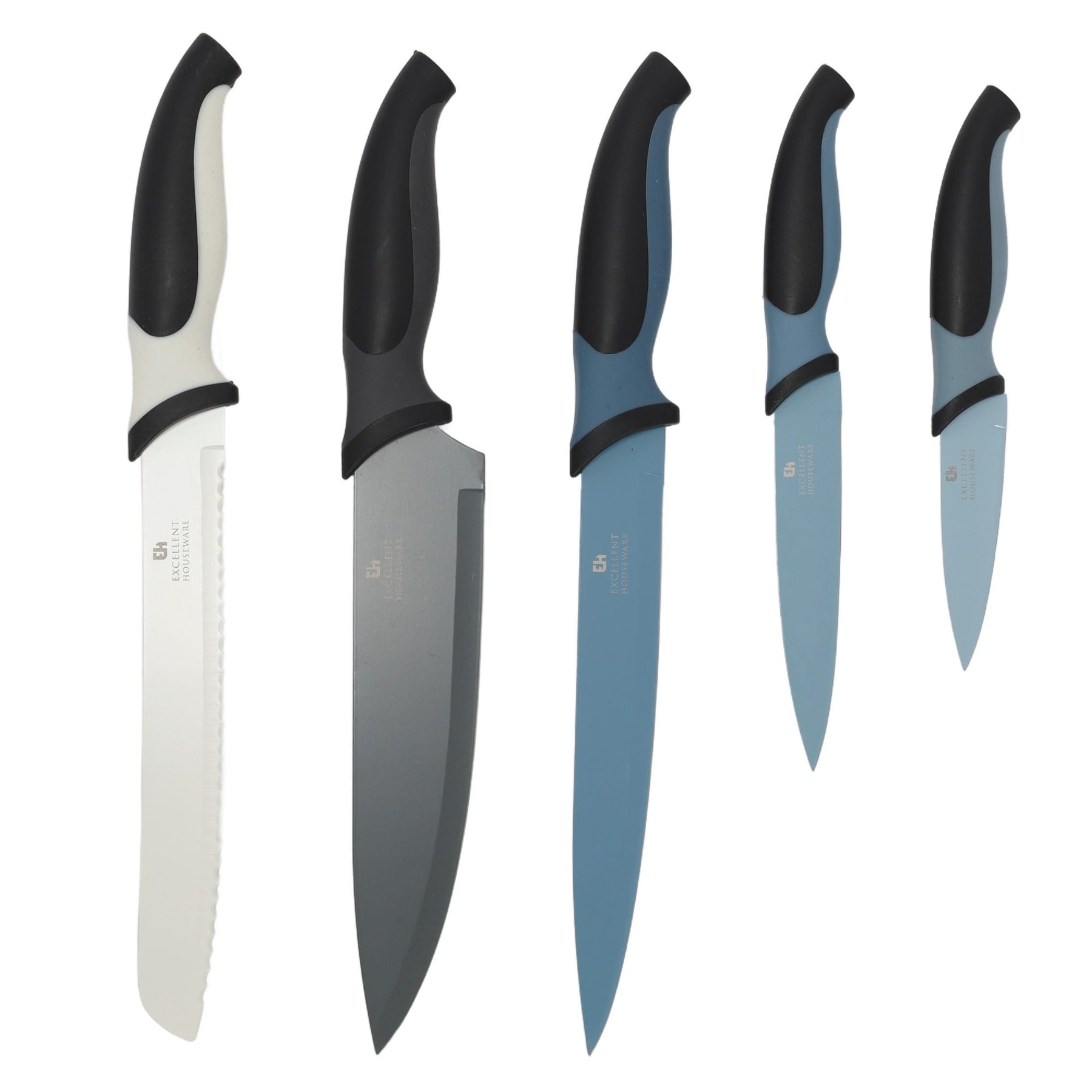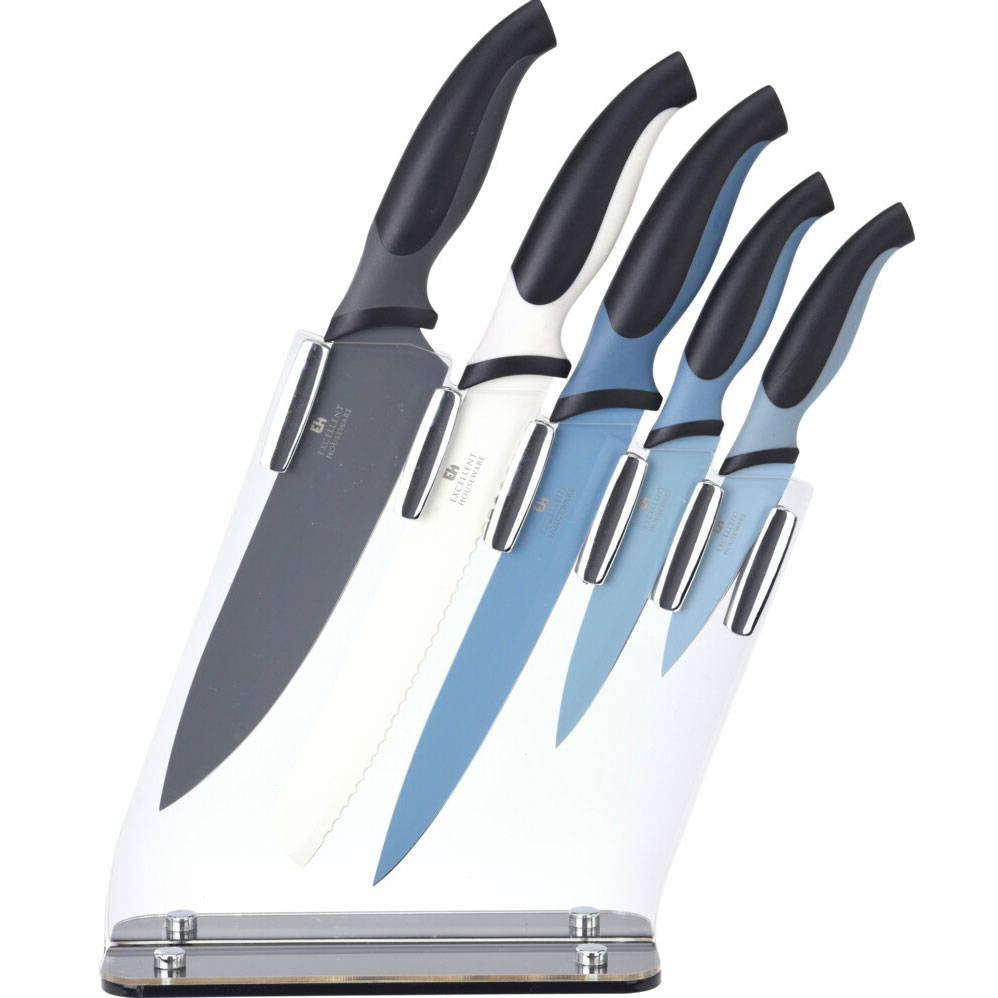 Zestaw pięciu noży, do różnego rodzaju artykułów spożywczych, znajdzie szerokie zastosowanie w profesjonalnych kuchniach, jak i w zaciszu domowym. Przeznaczone do siekania warzyw, porcjowania mięsa, krojenia chleba i obierania, wykonane zostały z wysokogatunkowej stali nierdzewnej. Niezwykle ostre ostrza wyposażone zostały w ergonomiczne uchwyty, dzięki którym ich używanie będzie łatwe i bezpieczne. Do zestawu dołączony został również blok, w którym można je przechowywać, dbając o bezpieczeństwo domowników. Dodatkowym atutem akcesorium są kolorowe ostrza pozwalające na szybką identyfikację potrzebnego właśnie noża w przestrzeni kuchennej.