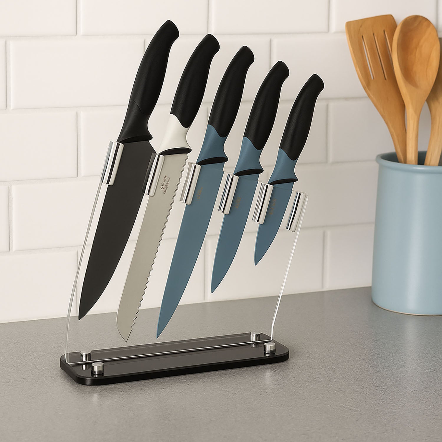 - kolorowe ostrza pozwalają na szybkie odnalezienie potrzebnego noża w przestrzeni kuchennej,