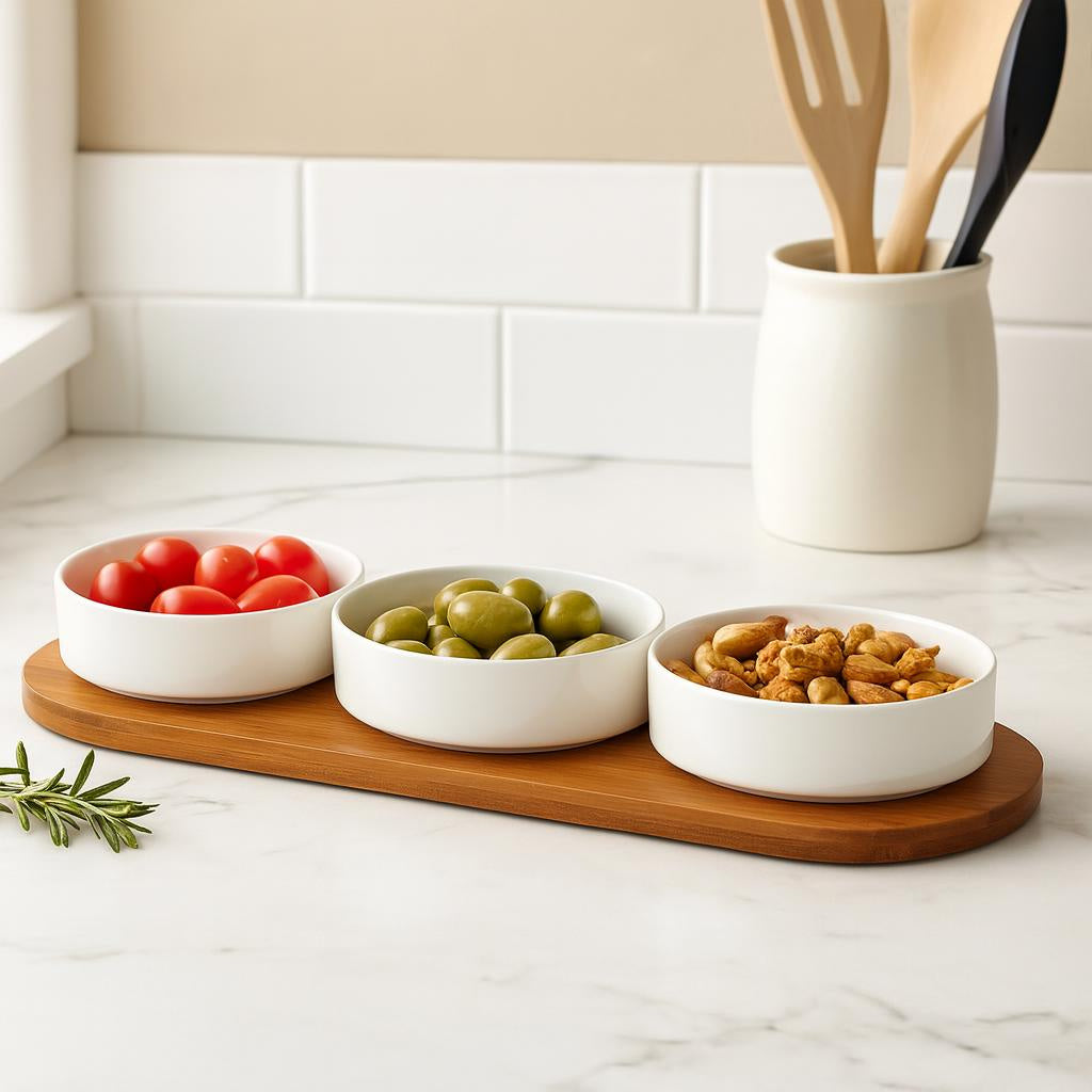 Elegancki zestaw porcelanowych miseczek do serwowania przekąsek z bambusową tacą - idealne połączenie funkcjonalności i estetyki dla Twojej kuchni