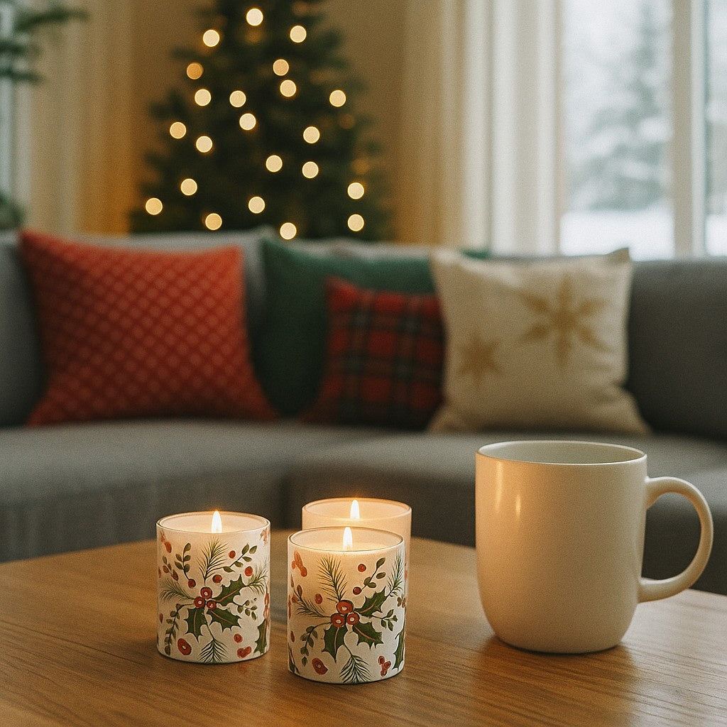 - Zestaw trzech świec zapachowych: Idealny na świąteczny czas, zestaw zawiera trzy świece zapachowe z pięknym nadrukiem świątecznym, które wprowadzą magiczną atmosferę do Twojego domu.
